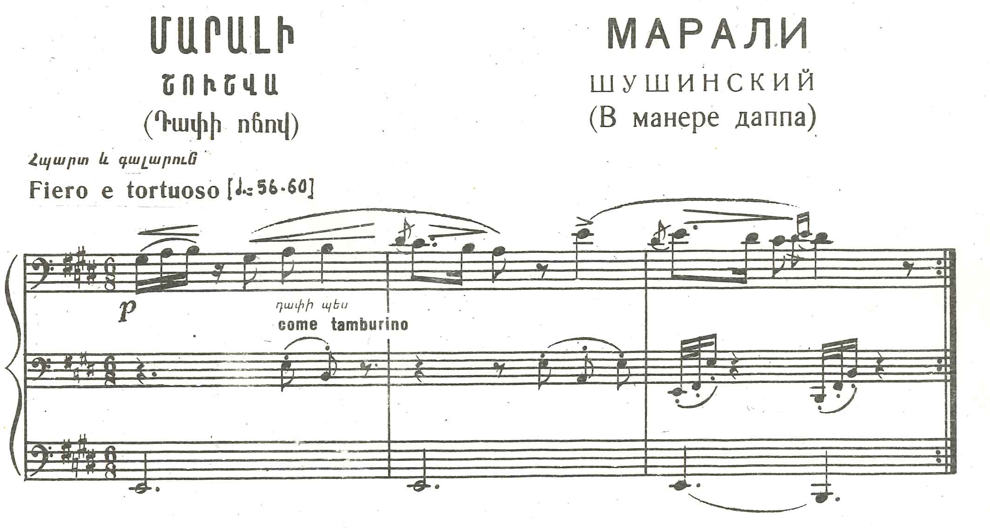 The OunabiandMaraliofShushi dances should be performed without stopping as they flow naturally on from each other: Komitas writes after Ounabi, Attaca. The composer marked these female solo dances as being in the case of the first, in the style of the tar and dap and the second in style of dap.