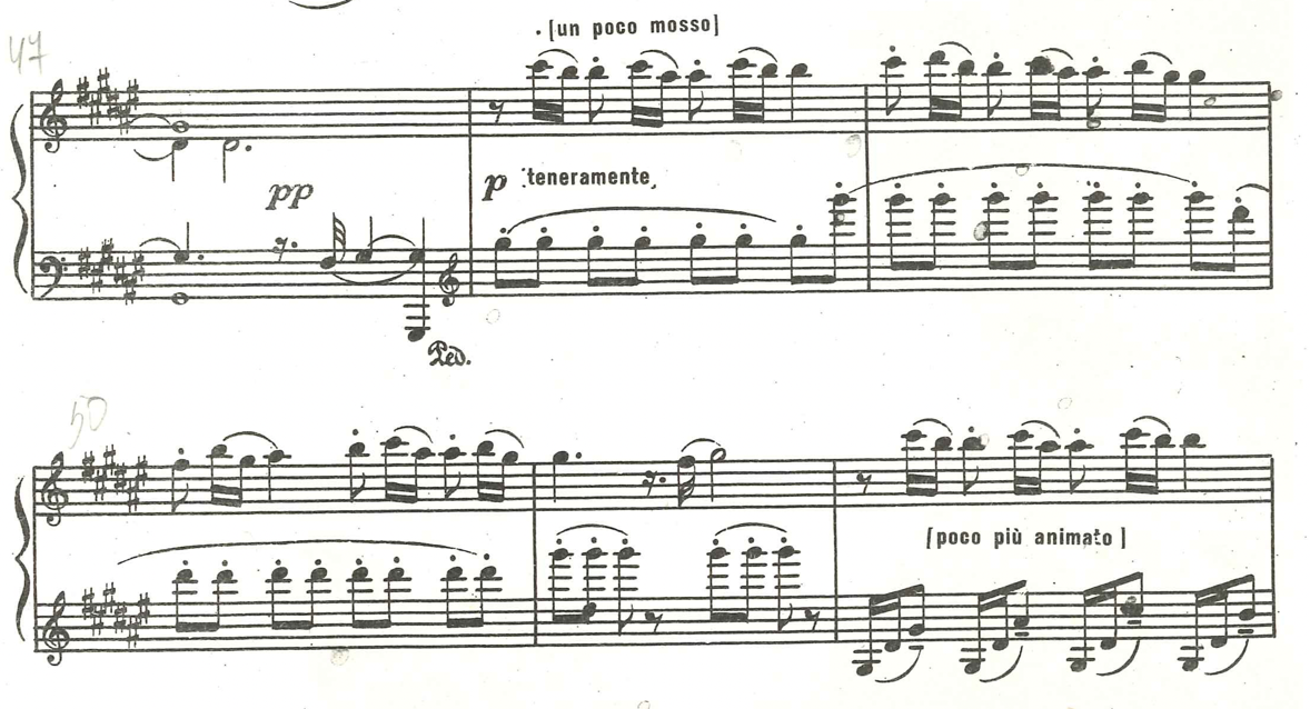 Komitas did not indicate the middle pedal in the scores of Msho Shoror, but despite that, in several places at which point the right pedal indication points to long musical patterns, sometimes four or even six bars of music on one pedal, evokes in me the feeling and the emerging need to create the effect of dam. Such place is the section of unpocomosso, where the composer wrote the right pedal on the bass of bar 47 without marking where to take off the pedal on the following phrases, and clearly hinted at his perception/wish for a sustained bass. I use, here, the middle pedal to achieve the imitation of the sustained bass (dam) of duduk from bar 47, which accompanies the melody. Even though the sustained bass clearly sounds over all four bars, unfortunately the sound of it is weaker in the third and fourth bars, and often in such places I wish to have possibility to be able to keep the sound of these sustained basses going much longer - and louder - than the grand piano mechanism in fact allows. Some of my pedalling can produce a certain lack of clarity to “classical” ears, with mixed overtones because of dissonance intervals that I imagine as the effects of the microtones of not perfectly tuned folk instruments, which I then try to recreate on the piano as my response to folk aesthetics.