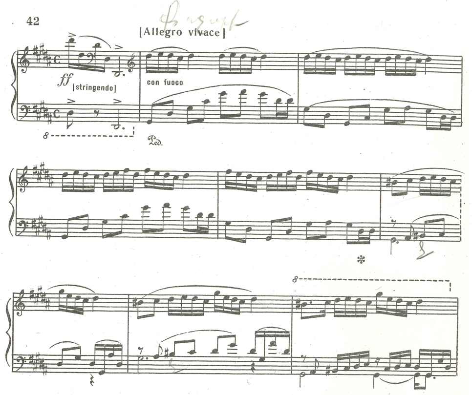 The next section of Kokh - Allegrogiocoso is a male dance melody. Here too I combine the contrasting articulation of slightly heavy legato and staccatos, having in mind the sound of zurna and tmbuk. I have played this section slightly faster and with a lighter flow than the previous one, with a clear articulation and minimal pedalling, avoiding elements that would sound as a romantic expression.