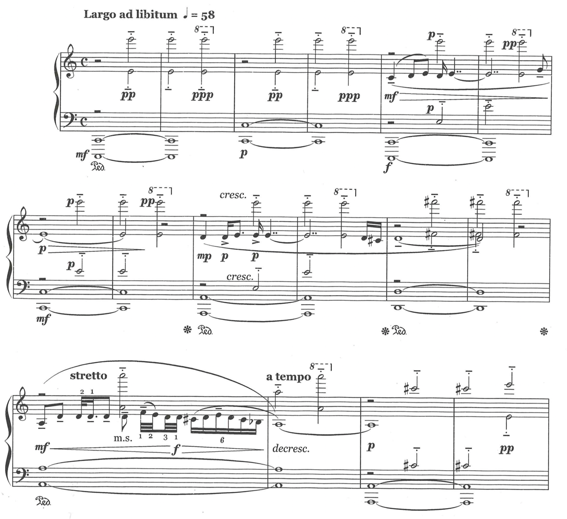 In this song, (from bars 13 to 16) I have used the middle pedal as a tool to create on the piano the effect of sustained basses - dam; this has helped me not to mix the free declamatory melodic lines with the basses and the upper notes of the piano accompaniment, creating musical layers individual in expression that are "audible” to the listener. Even though I play the whole song entirely with pedal, I nevertheless chose my articulation in a way as to be intensely focused, with a certain sense of core, even in the soft dynamics of pp, and p, which allows them to transmit the seriousness and the sense of meditative diving into the sound layers of the song. In addition, the duduk’s sorrowful, vibrating velvet timbre playing the melody transmits the profound inner struggle and meditative aspects of Antuni.