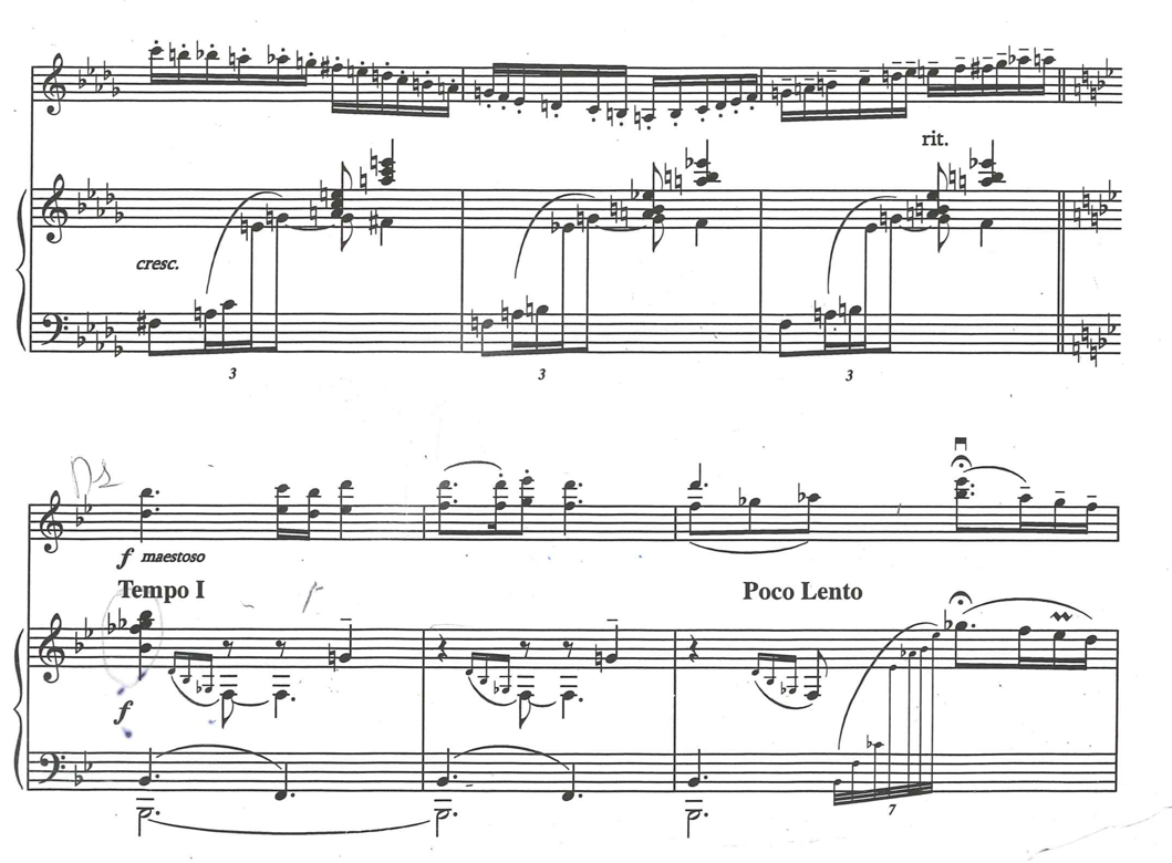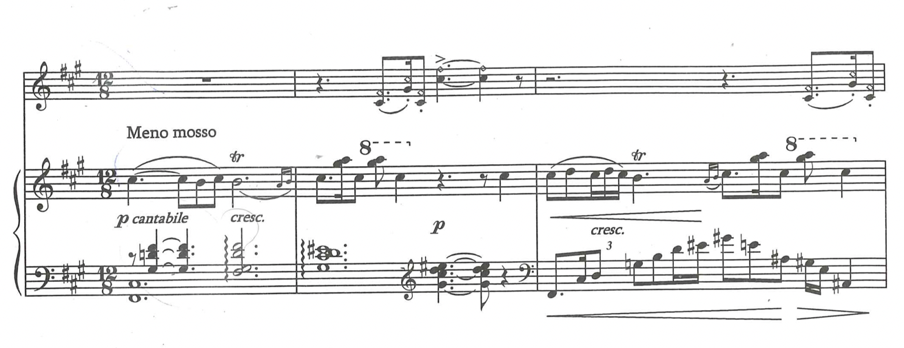 I wanted to emphasise the rhythmical motif in the piano introduction of the 1st movement, Andante con dolore, molto espressione, with its swaying movement, colourful and slightly sorrowful harmonies, and reflective manner, and arrive at a declamatory expression of it. This swaying, rhythmical motif reminds me of the Largo in the Msho Shoror of Komitas, which is similar in expression.