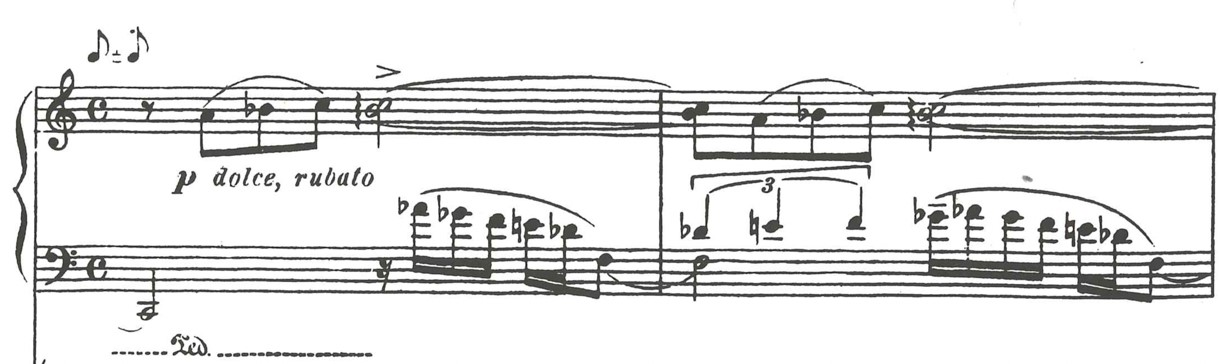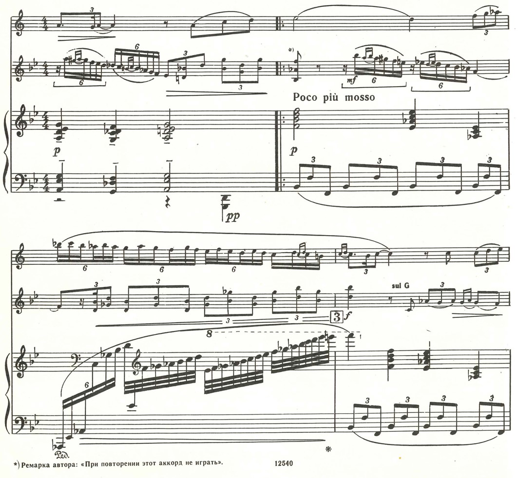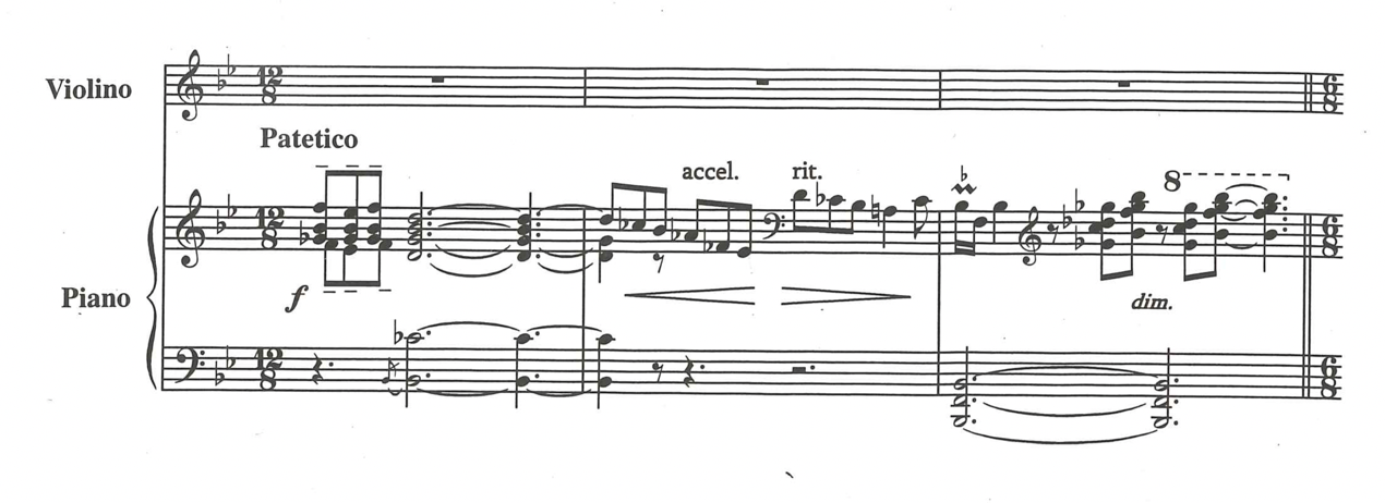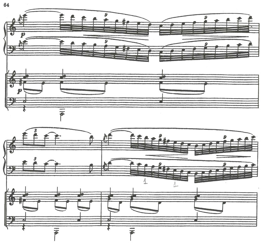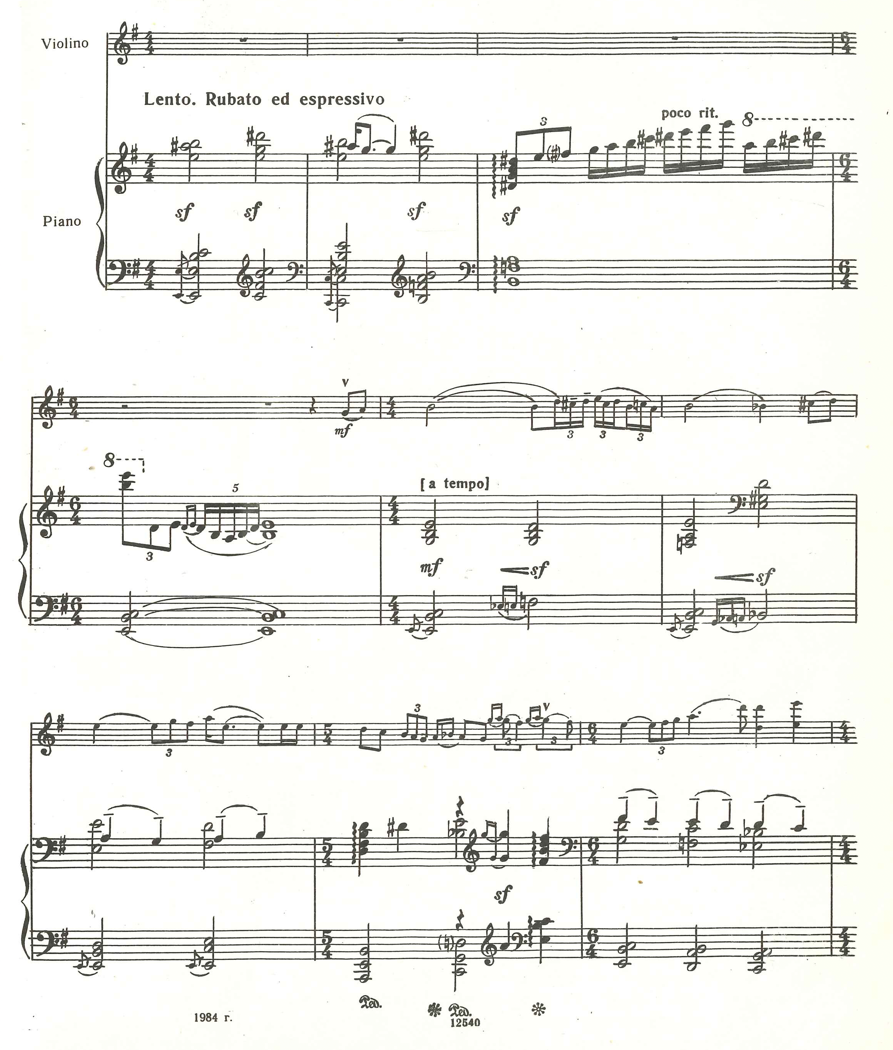 The music of the 1st movement is very lyrical and melodious, and is enriched by ornaments, both in the parts of the violin and piano. Particularly interesting are those ornaments with a chromatic upward motion in the basses of the piano part, and which create the impression of sliding from tone to tone - a glissando effect. In bar 63, from accelerando poco a poco, I use half pedal and vibrate it for three bars to achieve in that passage a blurred sound mass with blended overtones, and underline more the atmospheric aspect of the music rather than making it sound like a well-articulated, virtuosic passage.