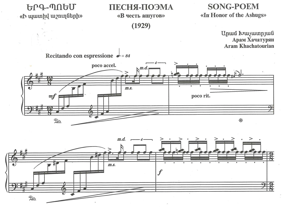 Khachaturian wrote the Song-Poem in 1929 when he was studying in Moscow. He was inspired by a meeting with Shara Talyan and his ashugh ensemble in Armenia House and dedicated the piece in honour of ashughs.