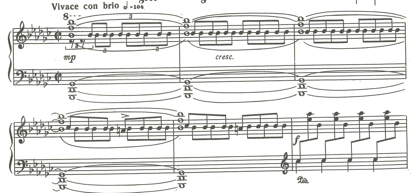 In the Poco meno mosso I wanted to keep the overtones of the passages with the pedal and build the phrases on it, using half pedal, sometimes just vibrating, in order to not lose the atmospheric “clouds” of overtones. However, at the same time, they were to be very transparent, with a lucid sonority. In the Meno mosso and a tempo rubato parts, the pedalling was important for me, with hanging overtones and a touch for the purposes of achieving a very warm timbre in sound: in my imagination a sense of a siesta, in which nature and all creatures are almost motionless under a hot summer sun in the mountains and fields.