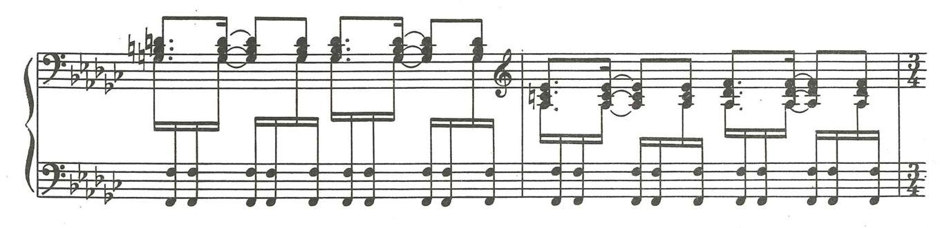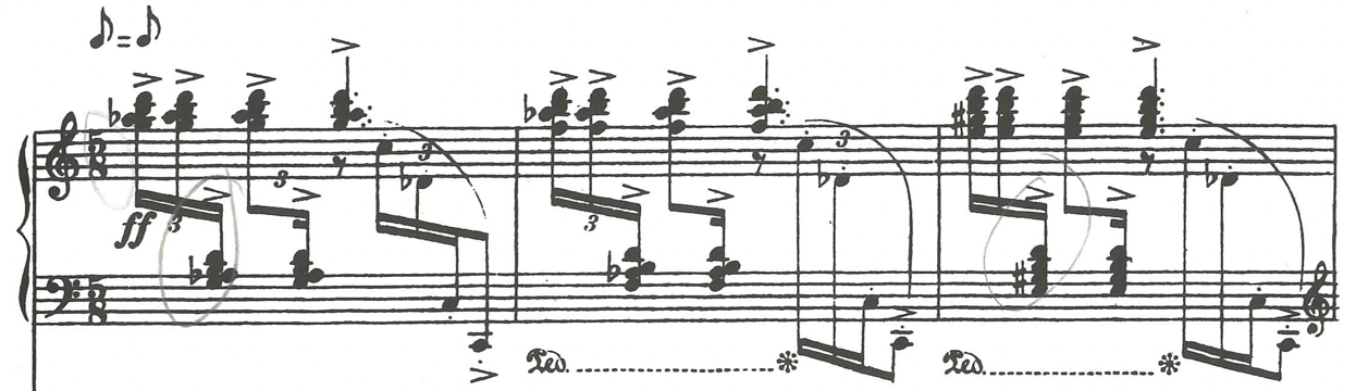 I can recognise the imitation of the dhol in the sections of repetitions and rhythmical patterns of the composition which were essential for me to articulate precisely, and to have conceptual choices with regard to pedalling that aimed to underline the percussive aspects of the piano. These repetitions in score example 44, surrounded with a sliding from upper to the lower tones, can be interpreted as an imitation of qanon too, since similar technique is characteristic of playing on the qanon. This gave me different opportunities in terms of searching for articulation, pedalling, touch and dynamics in this and similar sections of the Toccata.