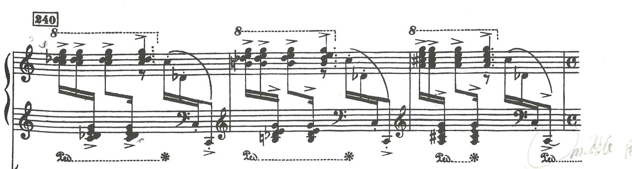 Instead of the right pedal indication of the score in bar 242, I use the middle pedal on the C, creating long sustained basses, as an effect of a dam, maintaining the bass with the middle pedal in bars 243-245 and building the melodic motifs and accompaniment on it, and when the tone disappears, I continue to build the overtones with right pedal. The whole cadenza, to me, is filled with free improvisational timing in every phrase and pattern, and the bar lines are out of context in this cadenza: I played it as if by ear, rather than like something learned.