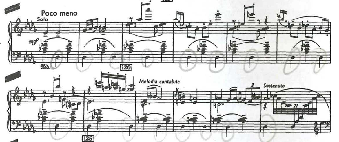 In the Lento, bars 73-75, despite the fact that there are no pedal markings, I use the middle pedal to separating the two different layers: the chord textured melody in the upper register with fortissimo and the lines of melodic motifs, like an echo responding to the chords written in the lower register with non legato articulation and in sub. p. To me, such an example of music was rare for Khachaturian, because usually he utilised sustained or long notes/chords, which are characteristic for the basses in the lower registers of piano, which play the role of a dam, but not in the higher registers. In the project, using the middle pedal in all cases has been as a tool for me to create the effects of dam. However, even though this particular place is principally different from all of the previously mentioned music examples in reflections, here, in my opinion, the use of middle pedal and holding the chords so that they sound for as long as they are written, serves to achieve clarity in articulation and creating voluminous musical layers without mixing them under one right pedal.