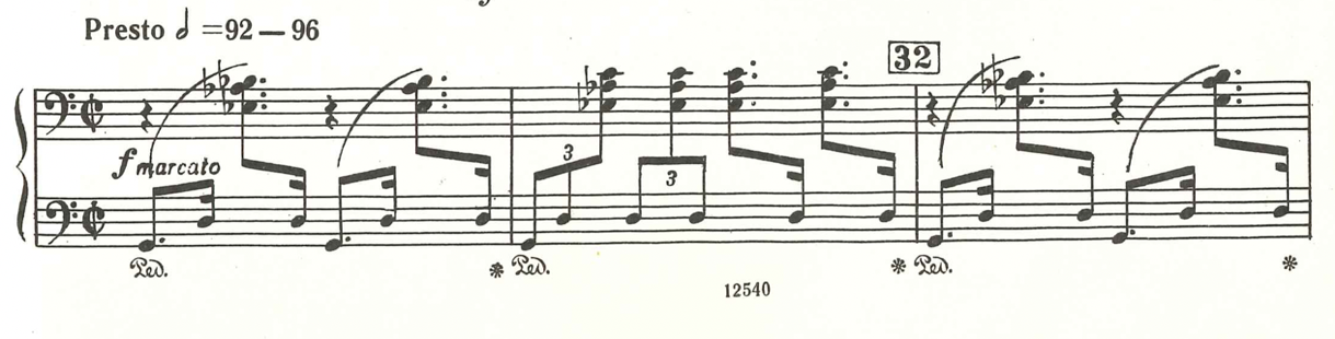 In my opinion, the piano plays entirely the role of a percussive instrument such as dhol in the Presto. It contains contrasts in expression from soft, light drumming effects to more sub. sf - sudden attacks on keyboard, and to creating polyrhythmic layers with the violin part. In the presto there are only two places of pedal marking: the first is specifically noted by Khachaturian - “use the pedal” – without it being marked as to where to take it off, whilst the second is the right pedal over the last four bars of the movement. I use the right pedal (half pedal) over eight-nine bars to create a blurred, drumming effect, which sounds as if it were from a distance – unarticulated - mixing the overtones and then gradually shifting to a no pedal sound and a clearly articulated drumming effect.
