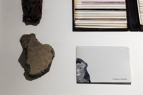 The Body as Landscape, Landscape as Archive explore the concept of landscape, as well as how it can be a potential container for personal narratives and histories. It was informed by sedimentary rocks and how they provide an archive into the earth's history. It was through identifying a relationship between the reconfiguration of these rocks (as a result of metamorphism), and the reconfiguration of self brought about by dementia, which helped her to consider the landscape as both an interior and exterior space. Through using materials and processes to represent this abstract perception of landscape as well as the landscape as archive. Retracing place from an archive meant the archive became a starting point rather than an end point, reflecting the delineation of time present in both metamorphic rocks and dementia.