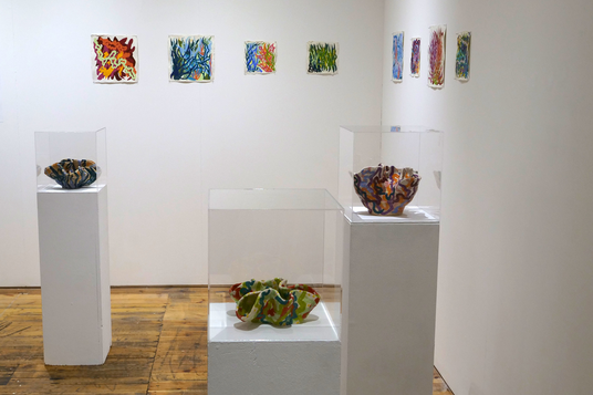 The series of works on display, in paint and ceramic, are developed from a walk Morgan has undertaken along the long stretching coastline of South Bay in Scarborough; walking amongst thriving rock pools, barnacle-covered sea walls and craggy rocks, across barren sandscapes littered with seaweed cast onto the shore by a violent sea. Her practice is situated within these natural environments, immersing herself within them, considering the ways in which the weather alters the colours around her, how the wind catches a certain leaf, how the sun distorts the view or how tiredness can disrupt focus. No photographs are taken during the walk, only notes and quick sketches in her 'field journal'. These are used in the studio to prompt a memory or feeling. Within the gallery setting, the works themselves take on a whole new phenomenological experience for the audience, prompting feelings of the strangely familiar, as most people will have, at some point in their lives, been immersed in a similar landscape.