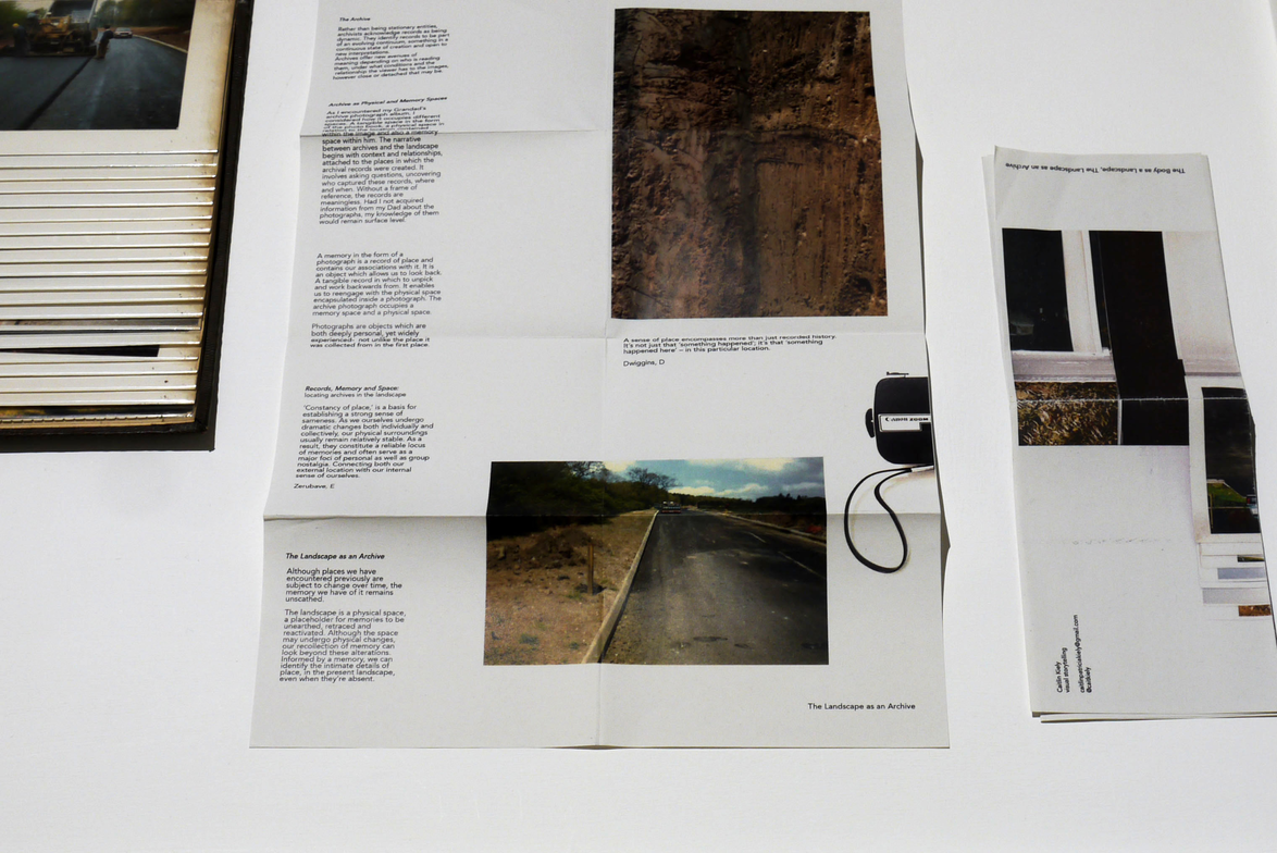 The Body as Landscape, Landscape as Archive (2018) began with Kiely's late grandfather's archival photo album, which documented his time in the construction industry. As he suffered with dementia his stories were often fragmentary and expressed incoherently. She, therefore, began to see a parallel between this and his photo album which had been subject to removal, loss and reorder throughout the years. In order to obtain the stories contained within these photographs, it involved asking her father questions in order to excavate his memories, which would otherwise have remained buried. Through this surfacing of memory, they collectively connected images with specific locations- allowing the archive photograph to transform into a physical place. This journey through place and memory not only pieced together her grandfather's fragmentary narrative, but also marked a new one between herself and her father. The Body as Landscape, Landscape as Archive (2018) explores the concept of landscape and how it can be a potential container for personal narratives and histories. It was informed by sedimentary rocks and how they provide an archive into the earth's history. It was through identifying a relationship between the reconfiguration of these rocks (as a result of metamorphism), and the reconfiguration of self, brought about by dementia, which helped her to consider the landscape as both an interior and exterior space.