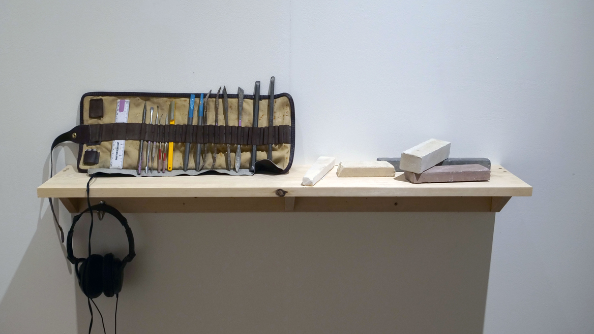 The Girl with the Paua Shell Eyes(2019) is loosely a self-portrait of the research practitioner. It was carved by hand from a block of Maltese limestone using traditional fire sharp tools and mallets. The exhibition documented the processes and techniques involved, including the original clay maquette, research diary, tools and the final carved form. This carving was Clarke's first substantial attempt at 'carving in the round' and forms part of a broader case study about the West Riding Stone Carving Association, based in Halifax. The carving process involved making a side and front template of the maquette and using it to carve across the block of limestone. A claw chisel and medium weight mallet was used for a roughing out phase along with some 'pitching' to remove larger pieces that were not required. To further refine the points a grid and plumb line helped to transfer additional measurements to the maquette. Flat, bullnose and gouge chisels were used with a dummy mallet to add detail and refine the shape. Finally, a range of files and rifflers helped to smooth the surface before finishing the sculpture with fine abrasive pads and sealing the powdery surface. Some colour and paua shell eyes were added to enhance the carved features and reflect light.