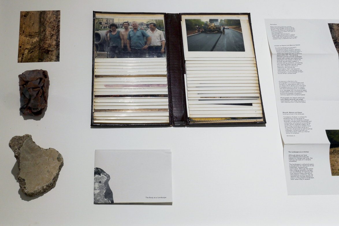The Body as Landscape, Landscape as Archive (2018) began with Kiely's late grandfather's archival photo album, which documented his time in the construction industry. As he suffered with dementia his stories were often fragmentary and expressed incoherently. She, therefore, began to see a parallel between this and his photo album which had been subject to removal, loss and reorder throughout the years. In order to obtain the stories contained within these photographs, it involved asking her father questions in order to excavate his memories, which would otherwise have remained buried. Through this surfacing of memory, they collectively connected images with specific locations- allowing the archive photograph to transform into a physical place. This journey through place and memory not only pieced together her grandfather's fragmentary narrative, but also marked a new one between herself and her father. The Body as Landscape, Landscape as Archive (2018) explores the concept of landscape and how it can be a potential container for personal narratives and histories. It was informed by sedimentary rocks and how they provide an archive into the earth's history. It was through identifying a relationship between the reconfiguration of these rocks (as a result of metamorphism), and the reconfiguration of self, brought about by dementia, which helped her to consider the landscape as both an interior and exterior space.