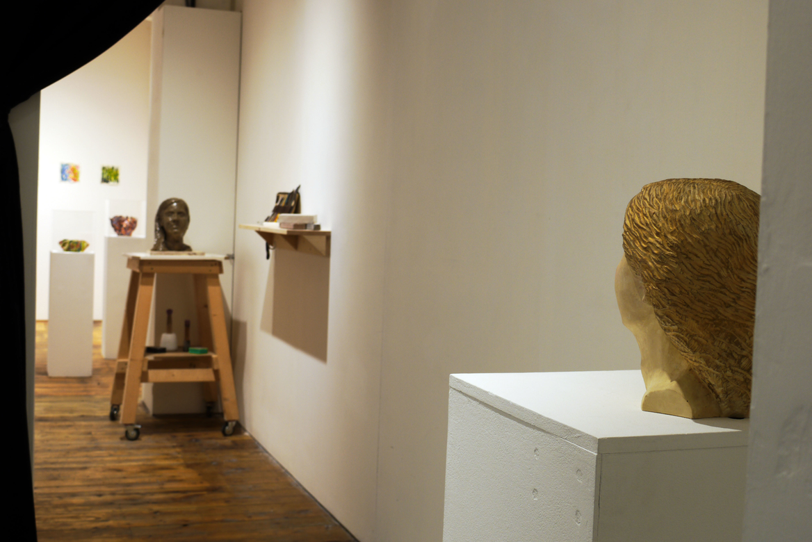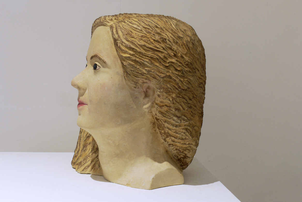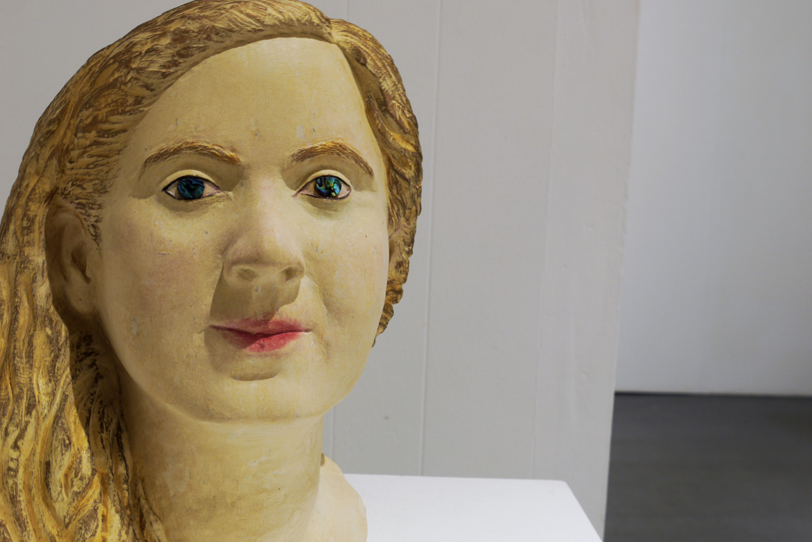 The Girl with the Paua Shell Eyes(2019) is loosely a self-portrait of the research practitioner. It was carved by hand from a block of Maltese limestone using traditional fire sharp tools and mallets. The exhibition documented the processes and techniques involved, including the original clay maquette, research diary, tools and the final carved form. This carving was Clarke's first substantial attempt at 'carving in the round' and forms part of a broader case study about the West Riding Stone Carving Association, based in Halifax. The carving process involved making a side and front template of the maquette and using it to carve across the block of limestone. A claw chisel and medium weight mallet was used for a roughing out phase along with some 'pitching' to remove larger pieces that were not required. To further refine the points a grid and plumb line helped to transfer additional measurements to the maquette. Flat, bullnose and gouge chisels were used with a dummy mallet to add detail and refine the shape. Finally, a range of files and rifflers helped to smooth the surface before finishing the sculpture with fine abrasive pads and sealing the powdery surface. Some colour and paua shell eyes were added to enhance the carved features and reflect light.