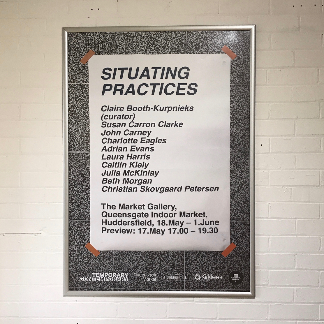 Situating Practices was a group exhibition showcasing the work of postgraduate research students at different stages of their research and from different creative disciplines- this included artist practitioners, architects and researchers working at the boundaries of social science and creative practice. The exhibition ran for two weeks from 17.05.19 to 01.06.19 and was part of the Temporary Contemporary programme, a partnership project between the University of Huddersfield Art, Design and Architecture and the Creative Economies team at Kirklees Council, functioning as a space of live action research in Huddersfield Indoor Market. Nine practitioners were selected through an open call to explore different configurations of (art) practice as research or research as (art) practice. The exhibition sought to engage in a dialogue about what it means to do research in, with and through practice. Influenced by the ideas of “situated knowledges” and “heterogeneous multiplicities” in Donna Haraway’s essay Situated Knowledges: The science question in feminism and the privilege of partial perspective (Haraway, 1988), it explored what kinds of situated and tacit knowledges are produced in practice and how different narratives, making processes and spaces are negotiated within these practices. The works in the exhibition drew on different methodologies and modes of communication in their enquiries, from methods that embed practice within different research sites, such as auto-ethnography and field diaries (Christian Skovgaard Petersen, Beth Morgan), to fieldwork within making spaces and communities (Julia McKinlay, Susan Carron Clarke). Some of the researchers used their creative practice to uncover and illuminate tacit knowledges (Laura Harris) or reveal narratives and histories that would otherwise remain buried (Adrian Evans, Caitlin Kiely). Other practices in the exhibition sought to intervene in and activate public space, using a satellite space within Queensgate Indoor Market as a place of further exploration (Charlotte Eagles, John Carney). Through situating research practices within a gallery space, the group exhibition sought to consider not only how the artefacts of practice-led research function, but what kind of new knowledges and experiences encounters with this work can generate.