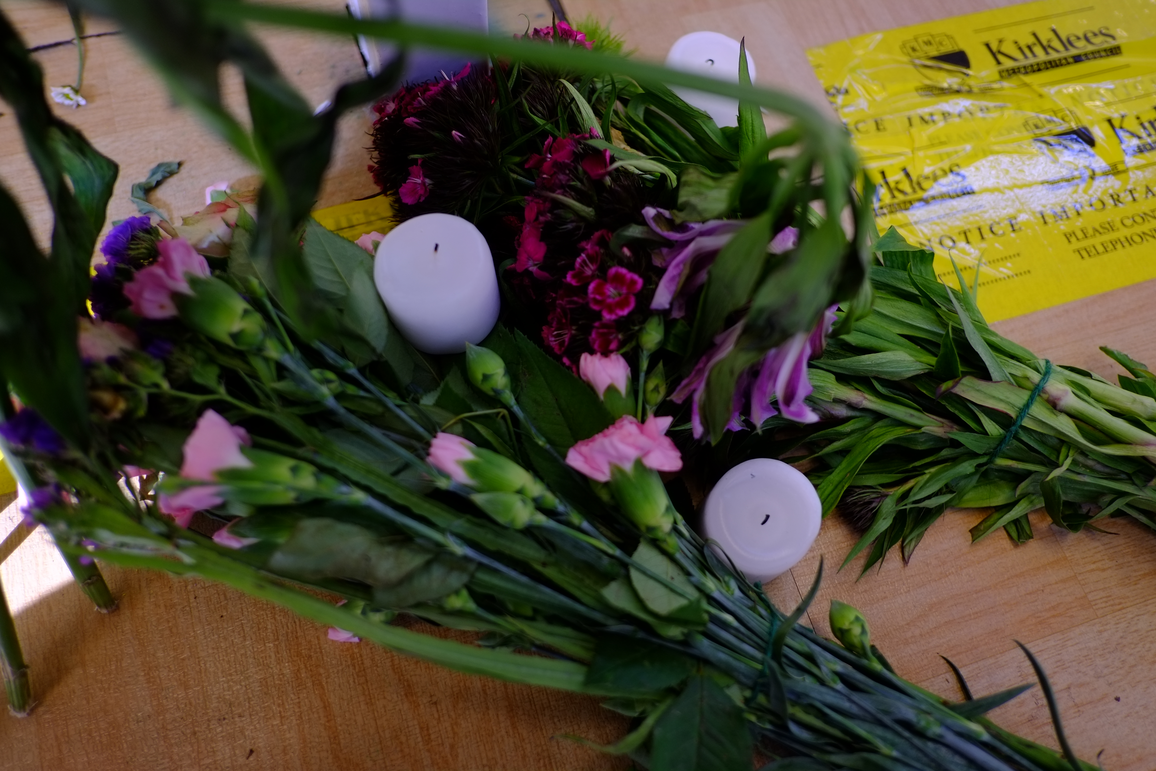 John Carney- Symbolic Retribution, 2018-2019, installation: flowers, candles, colour film photographs, archive box, gloves (photos: John Carney)