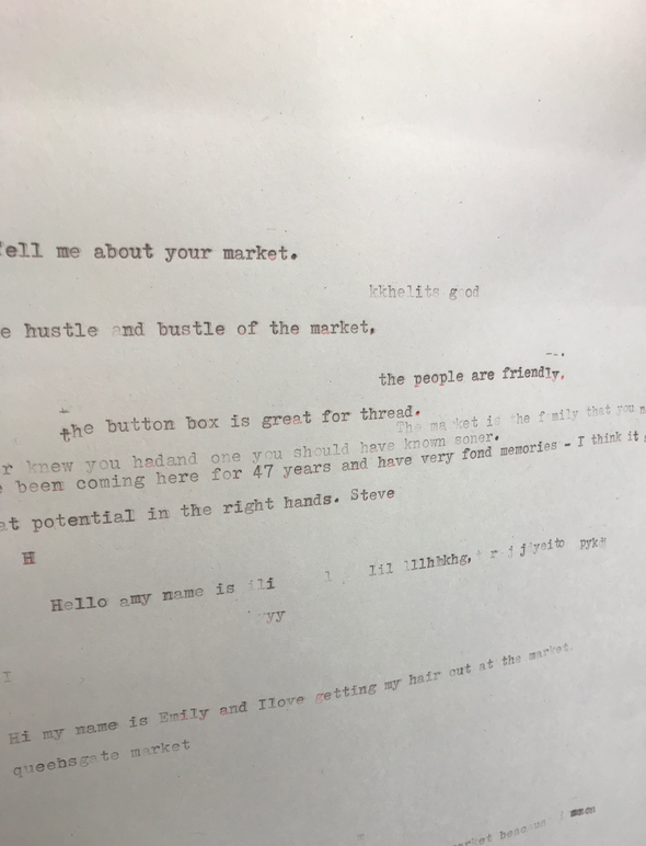 The Forum (2019),installed in the satellite space from 25.05.19 to 01.06.19, was developed as a structure comprised of a desk, a question, a chair and a typewriter with a roll of paper attached. The purpose of the platform is to provoke participation and investigate the varying positions and states of being the audience. It can be used as a tool to translate the reflections and perspectives of the audience by acting as a mediator between the audience and the displaying of work, whilst also questioning how common interests can influence a sense of unification and community. The Forum(2019) activated the space of Queensgate Indoor Market, allowing the audience the opportunity to engage with the work as viewer or participant, either visually by analysing the displayed text, or through assuming the position of participant to contribute to the ongoing collaborative narrative between the audience and the artist.