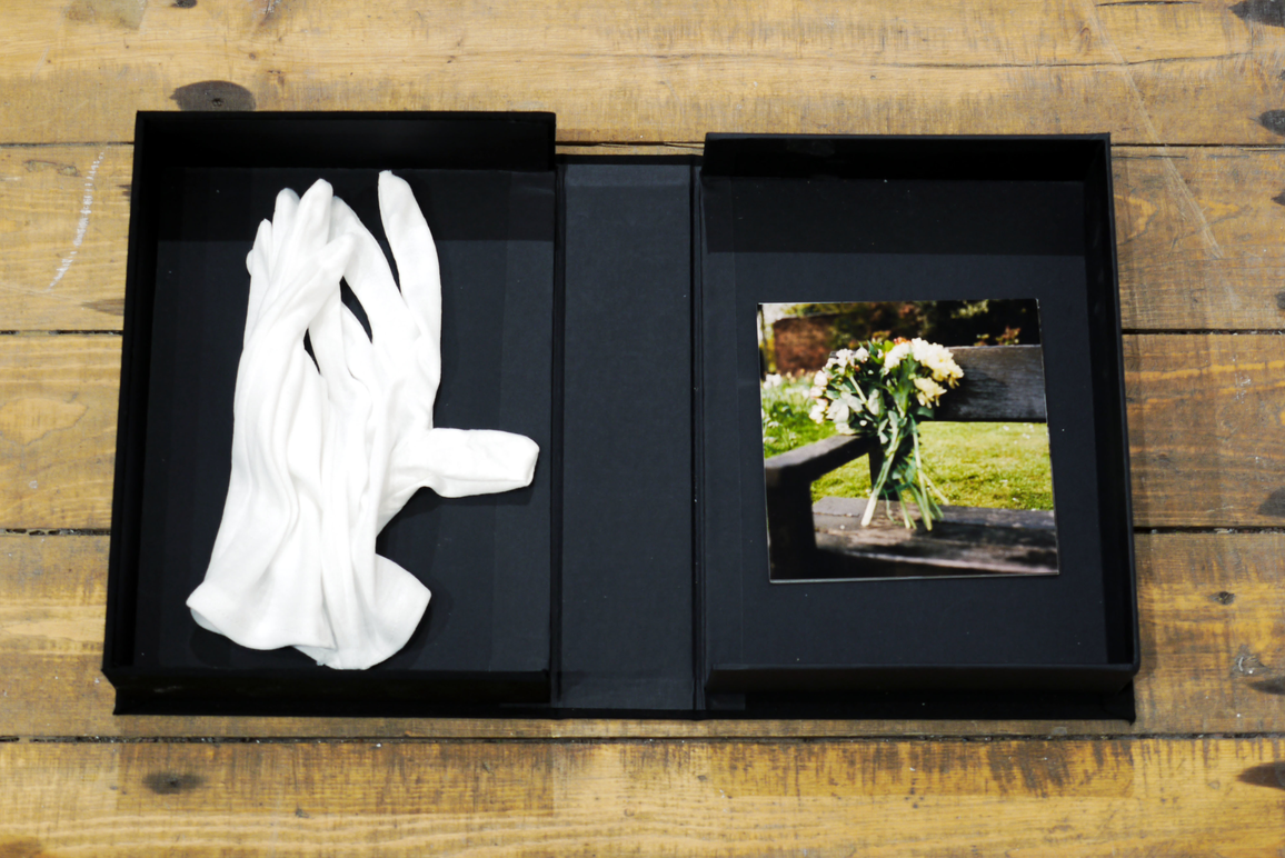 John Carney- Symbolic Retribution, 2018-2019, installation: flowers, candles, colour film photographs, archive box, gloves (photos: John Carney)