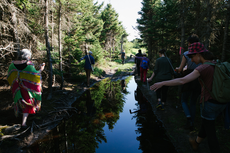 Compositional Routes of the Magdalen Islands is a soundwalk through the forest with portable radios, drawing inspiration from artists such as Andra McCartney and Hildegard Westerkamp, both of whom engage extensively with soundwalking (McCartney 2014; Westerkamp 2001), Kathy Kennedy, who has blended soundwalking and radio art (especially in her HMMM Project) and other artists working with microFM transmission such as Anna Friz, Amanda Gutiérrez, and Tetsuo Kogawa.[2]