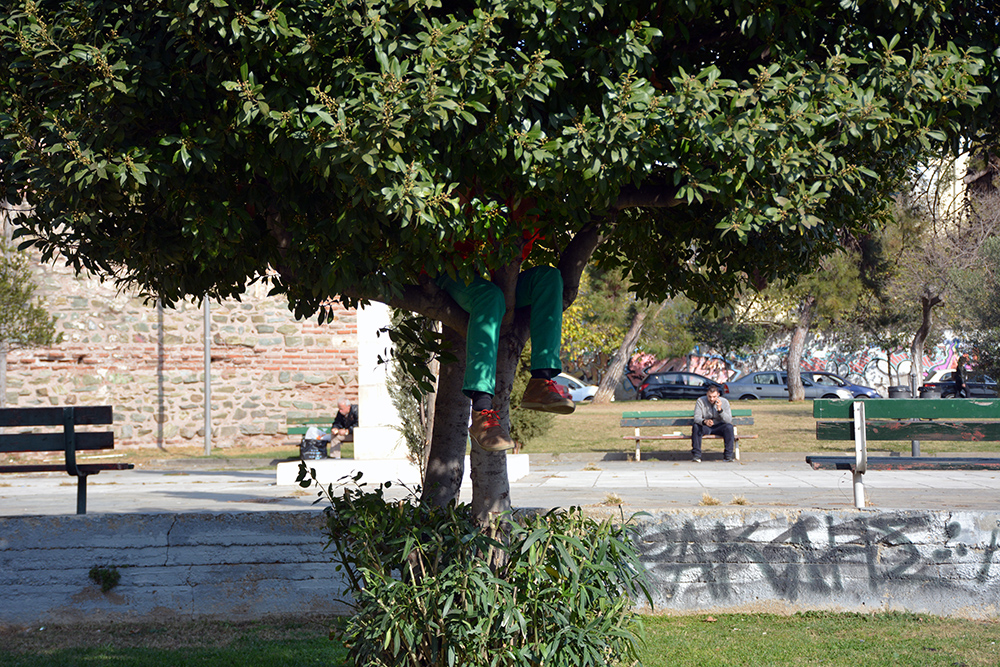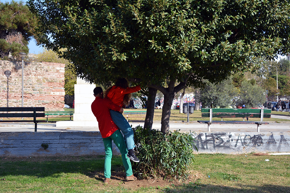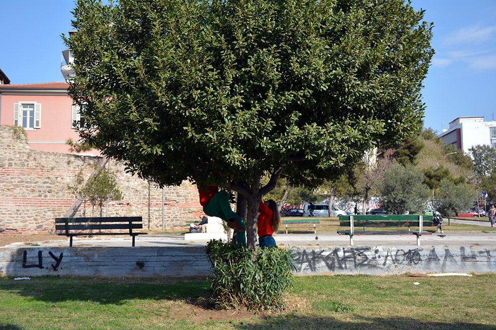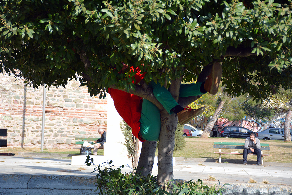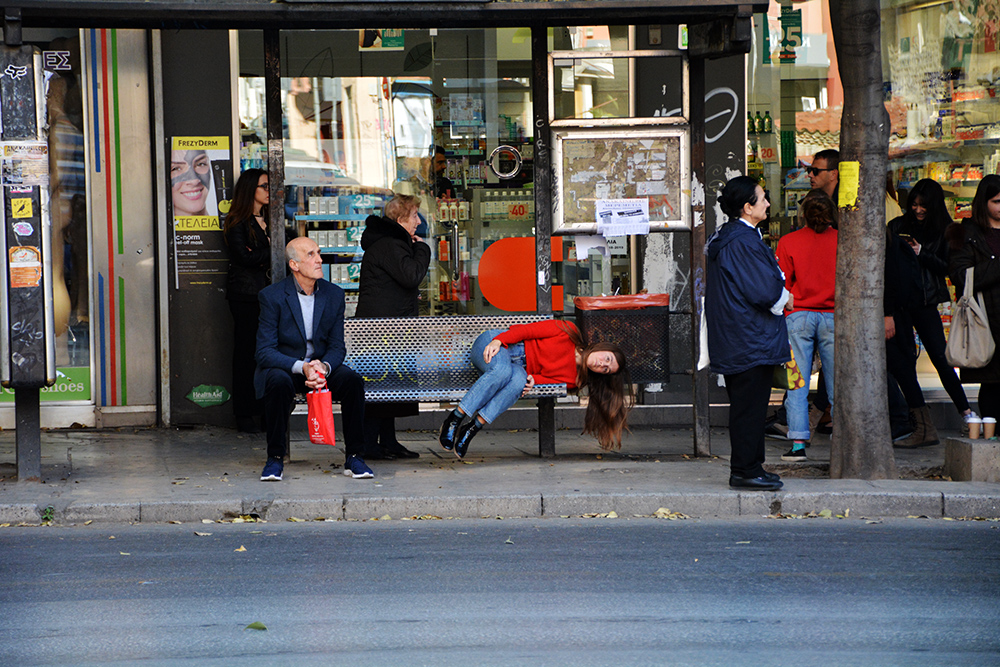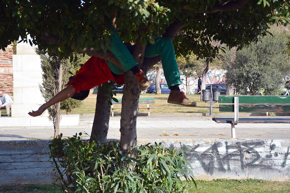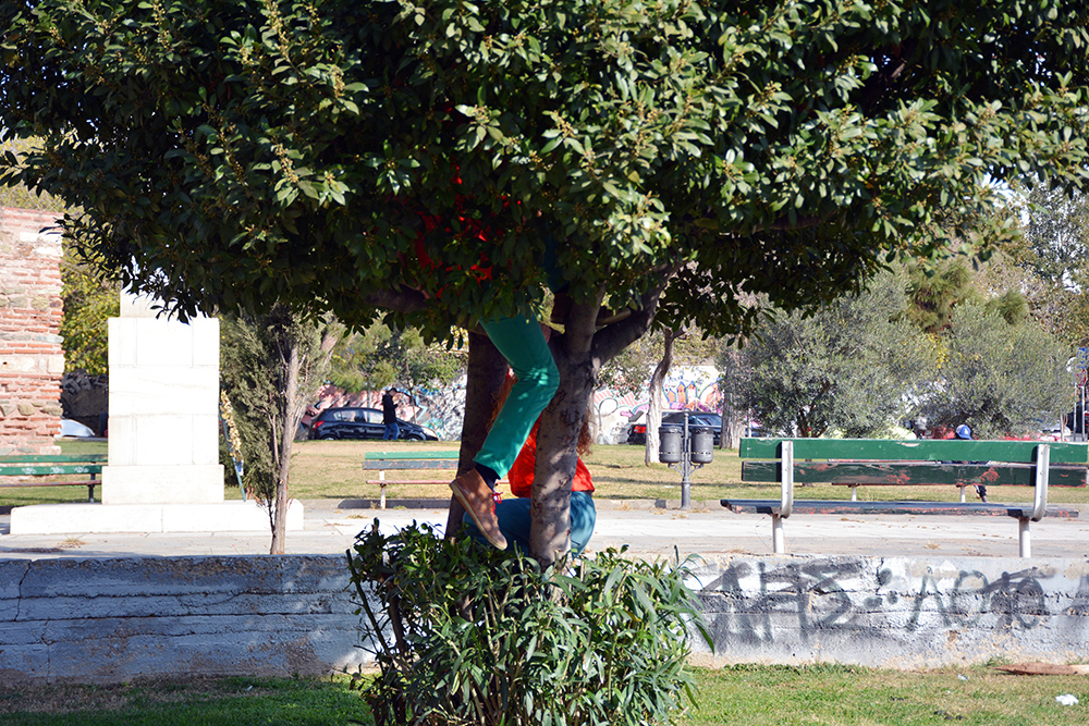 Then we went outside. I had in mind to go somewhere else but there was not enough time, so we went to the same square. We choose a spot, a bench and we play with the idea of comfort – how can I be comfortable on the bench – how can I be comfortable in public. We let it go a lot off limit!