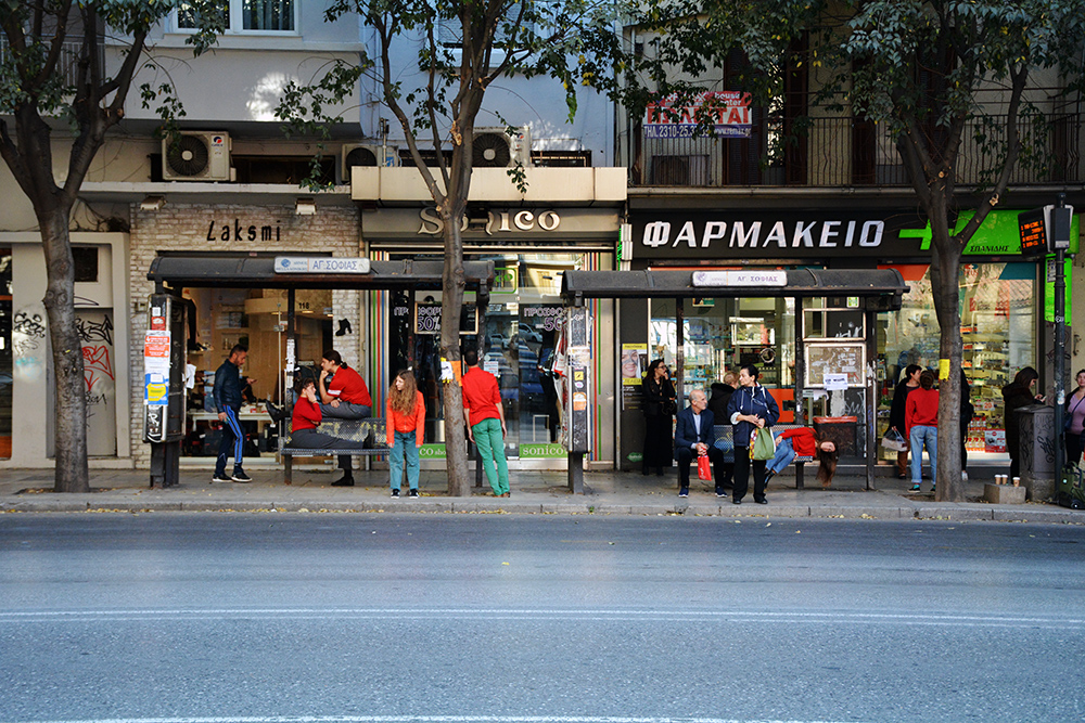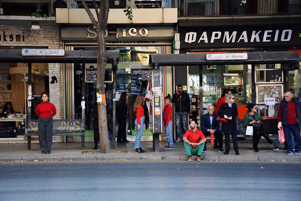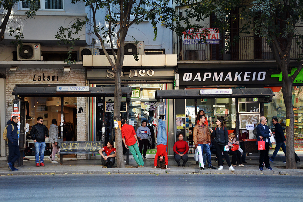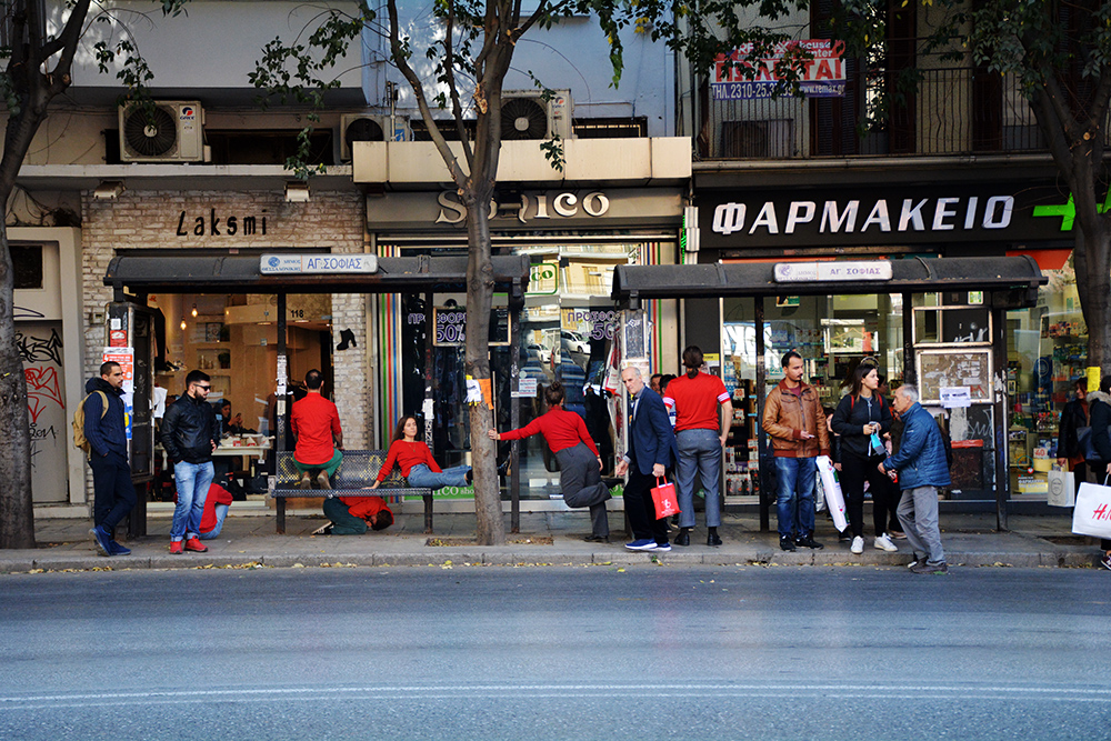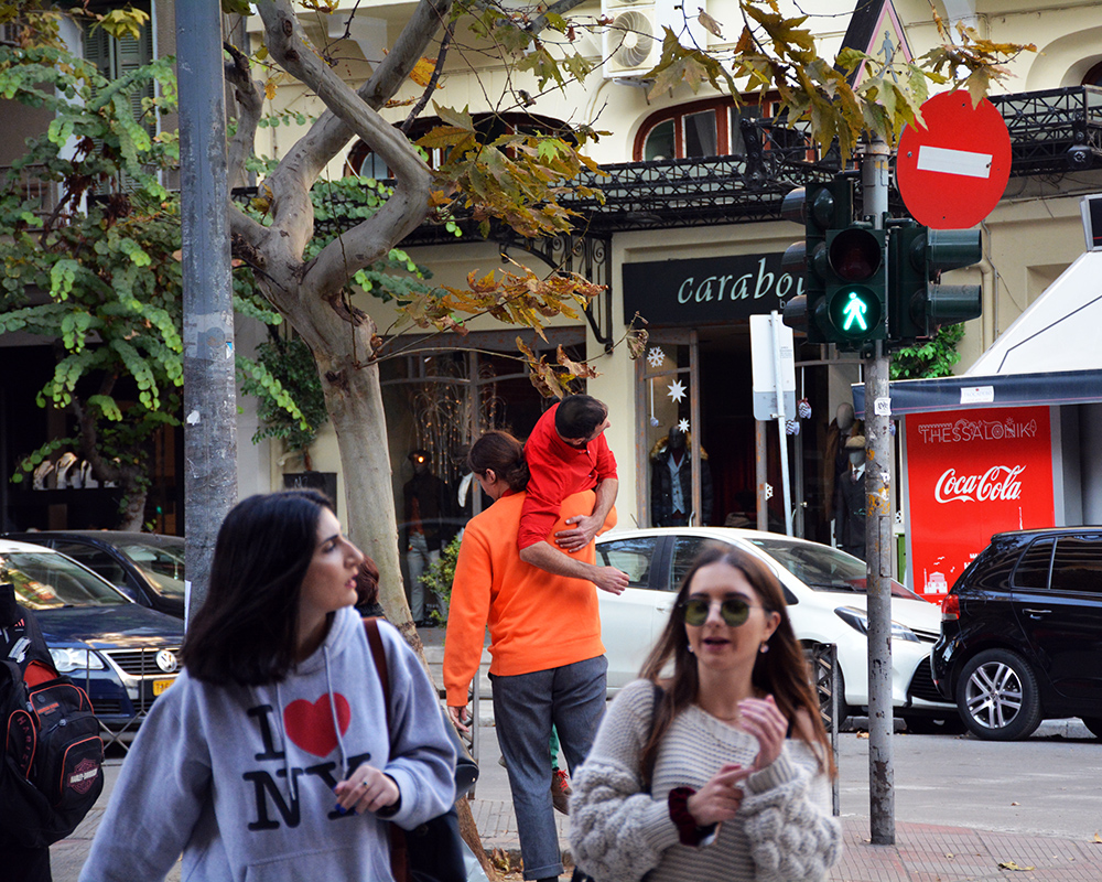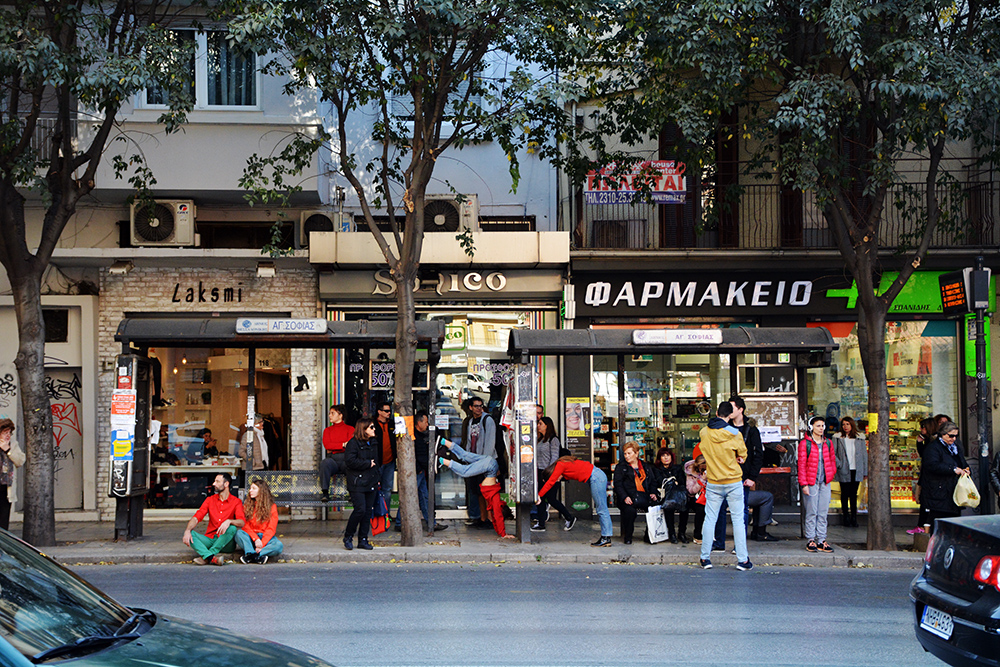 Then we move to Ag. Sofias – a pedestrian street. We go along the street several times as a group, trying to alternate between a ‘natural’ to a ‘strange’ state all the time.