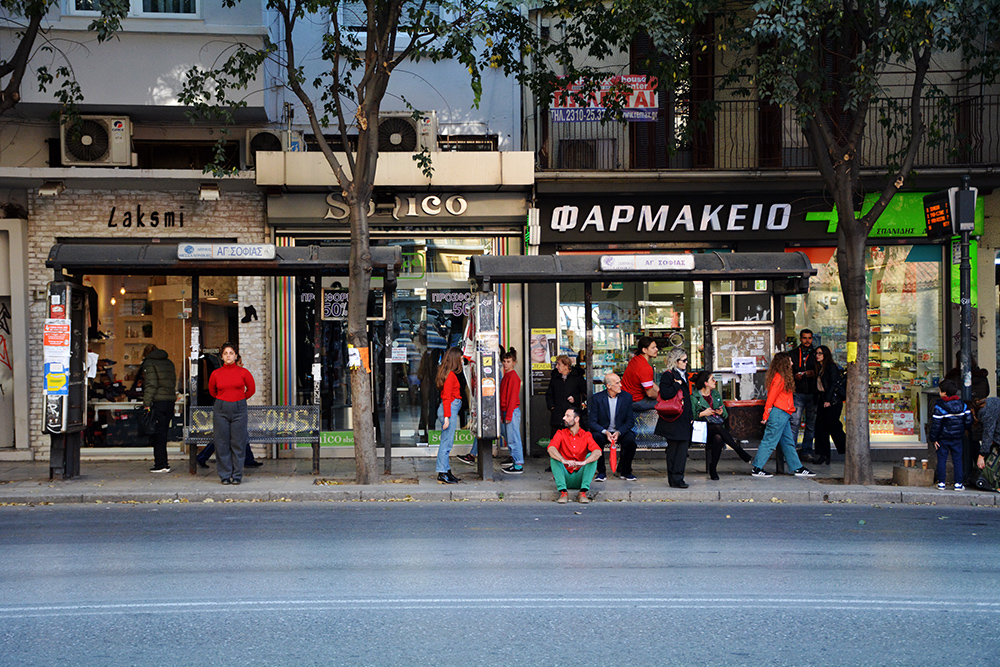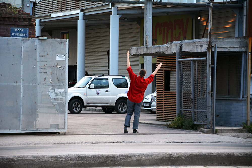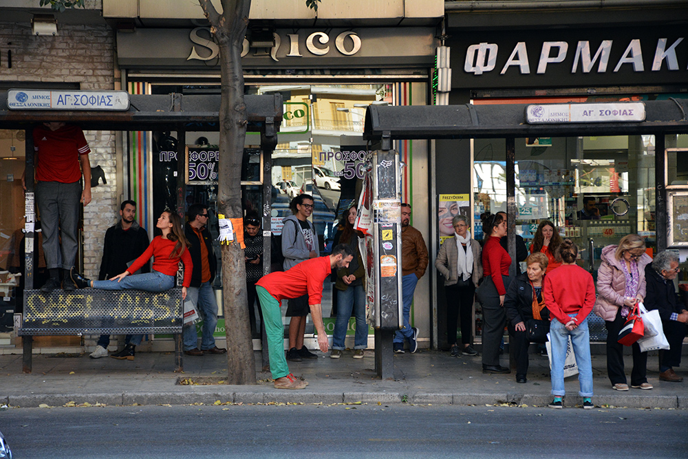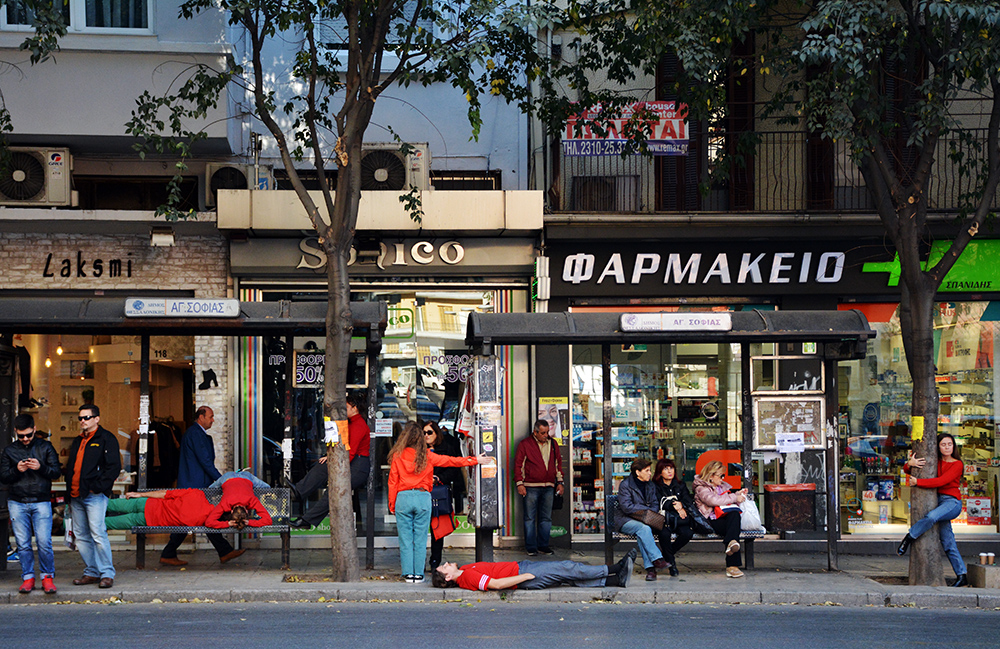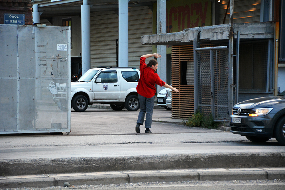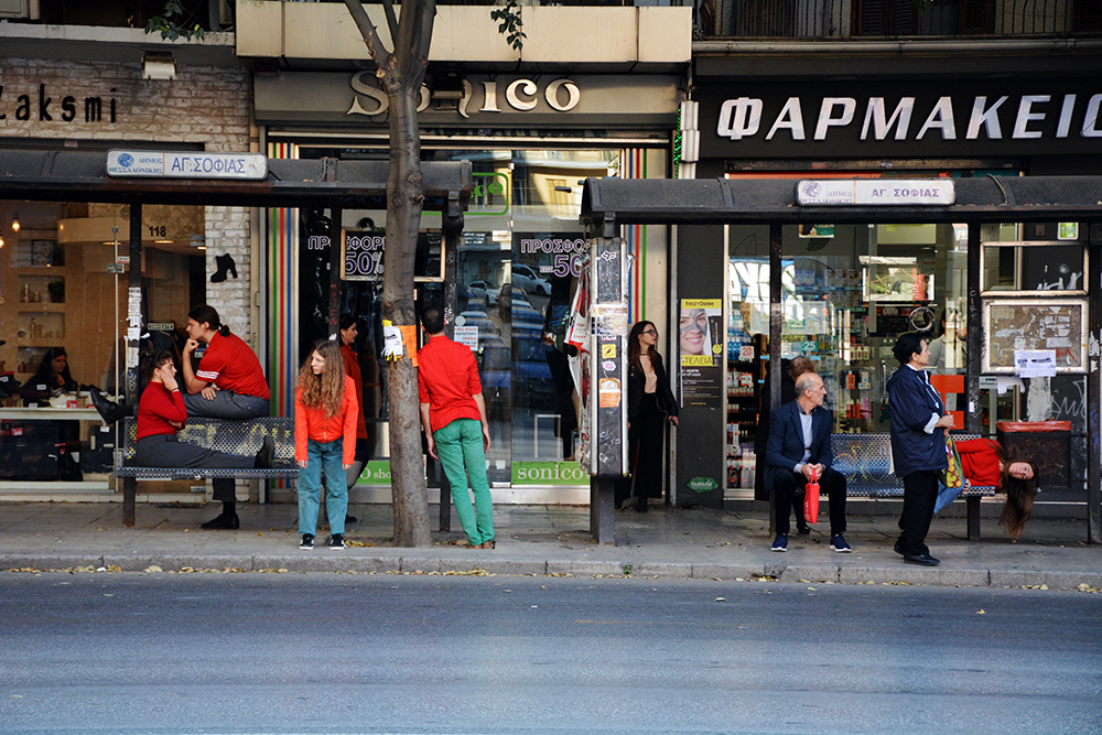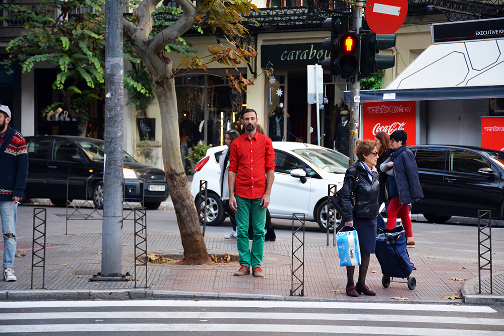 Then we move to Ag. Sofias – a pedestrian street. We go along the street several times as a group, trying to alternate between a ‘natural’ to a ‘strange’ state all the time.