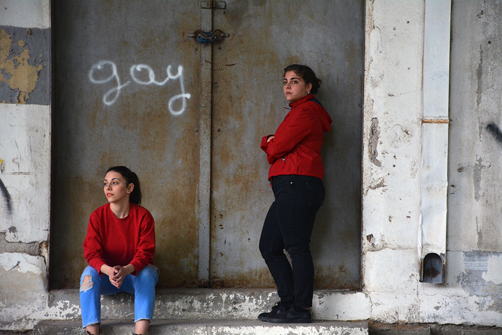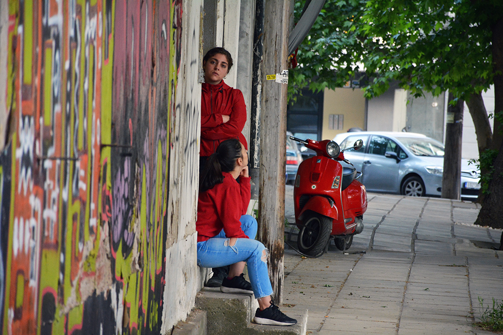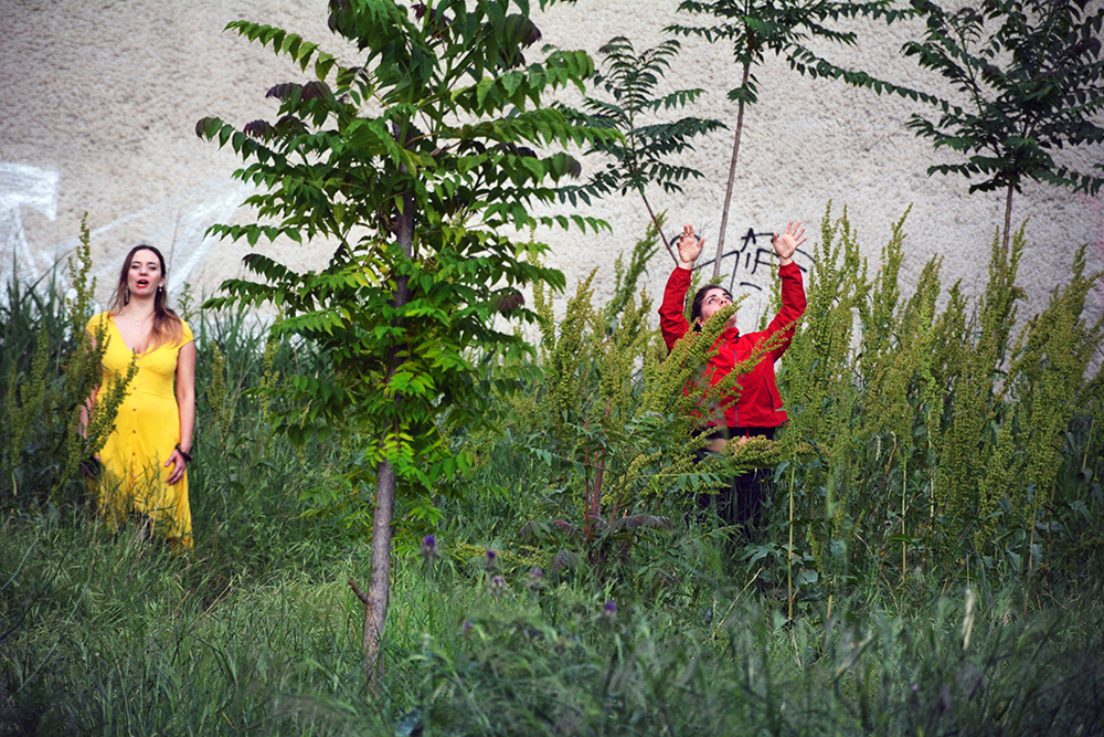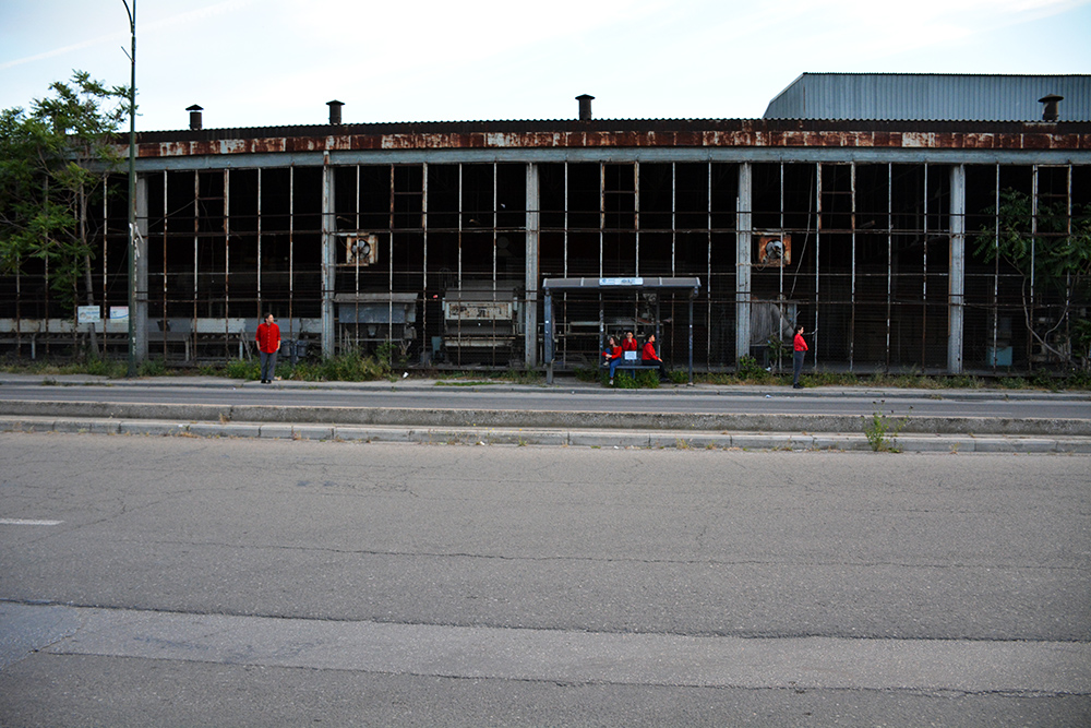 We start with the ‘easier’ shots involving one or two performers. Then we move on to the new locations we chose for the bus stop and street crossing, which work perfectly. Here not much is set for the performers, just a general score – but everybody is super-creative and the group works super well together! We get a lot of interaction and questions from people around.