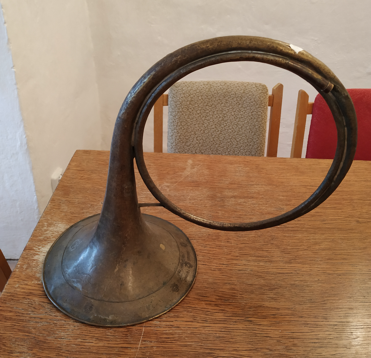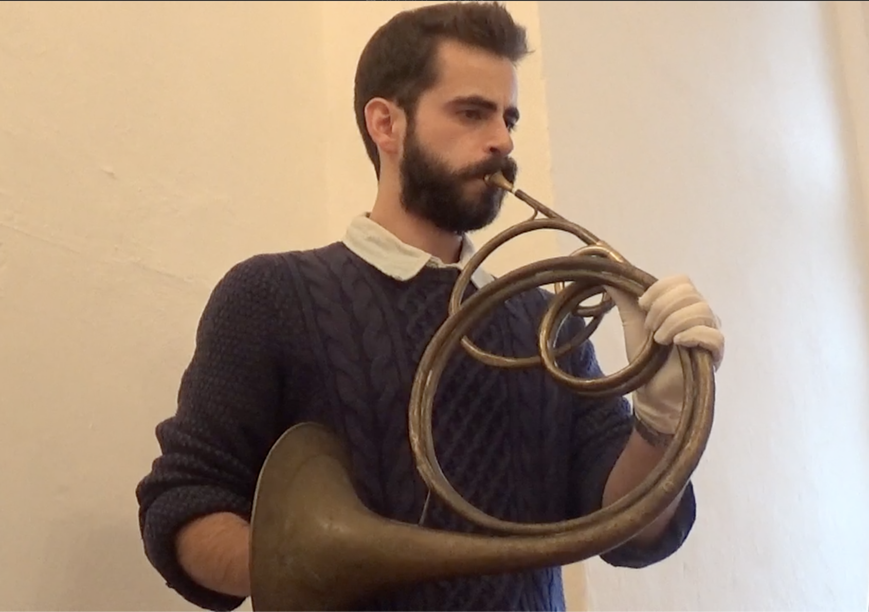 No crooks survived : I had to deal with a couple of baroque crooks I brought with me, and eventually recorded the horn with a crook from a Egger hand horn that Mr. Vaclav Luks kindly lent to me (I was only able to play in E-ish). This was of course far from being historically appropriate, there is probably no way to know the exact original sound of this horn ; but I did my best in the very short amount of time and organization I had. There is always a way one could do things better ! However, the experiment was still enlightening.
