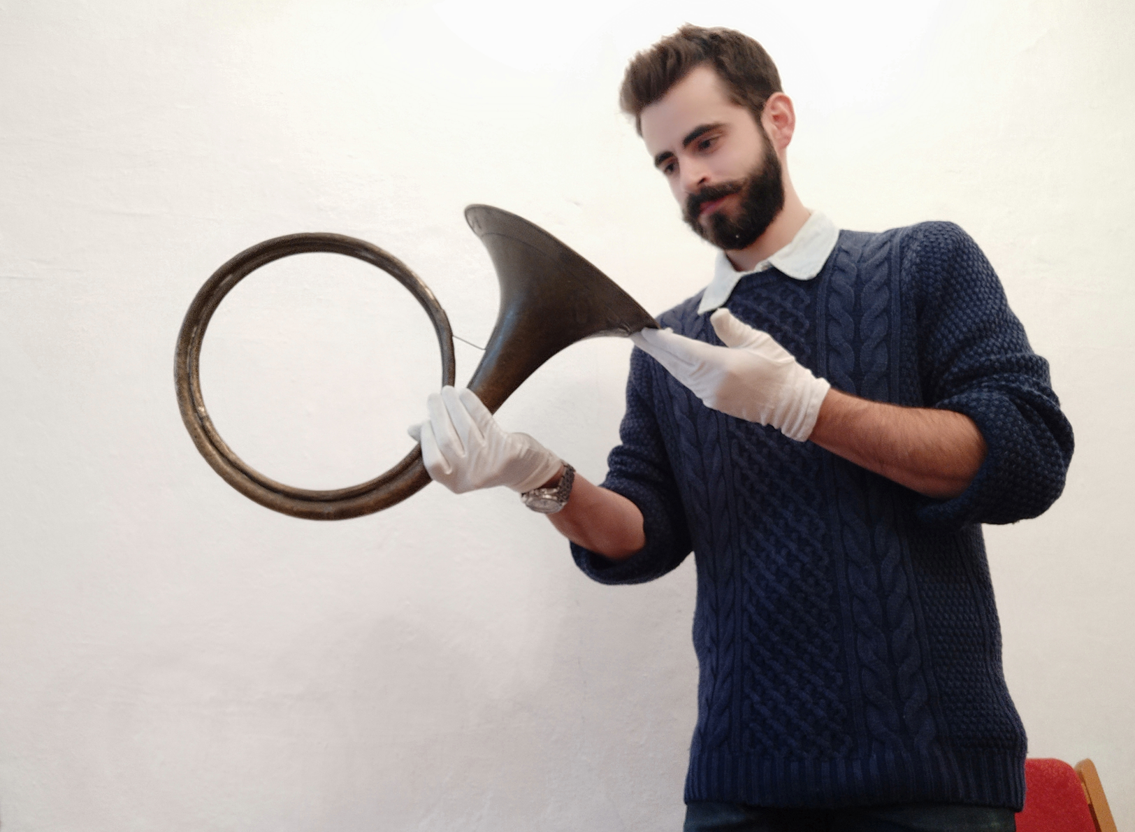 As a result, the hand technique (read as : the possibilities of movement) was limited : one could only use a quick and small move of the wrist to close the bell. Fingers had to stay still. I have the habit to use all sorts of different hand moves and « fingerings » in larger French horn bells in order to get the best sounding stopped notes or to vary their colours : this was nearly impossible here. As a consequence, I could not rely on the hand as much and most of the work had to be done with my embouchure, tongue and air.