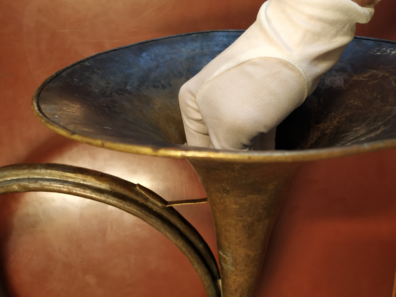 For the record, there is a chance this horn was originally a horn in G with a fixed lead-pipe. According to the restoration report made by Stefan Katte2, the lead-pipe had been at some point cut off and the first hoop of the horn was probably removed. A socket was put in place to be able to add crooks on the horn. It is then not in a fully original state, but it illustrates this transitional period that was described in the historical part of my work. This also means that the horn probably wasn’t meant to be played with hand technique at first ; but the transformation it has been through reveals that players had different needs at a certain time, and my experimentation on it (which I am about to describe) show that hand technique is absolutely not a problem on this horn.