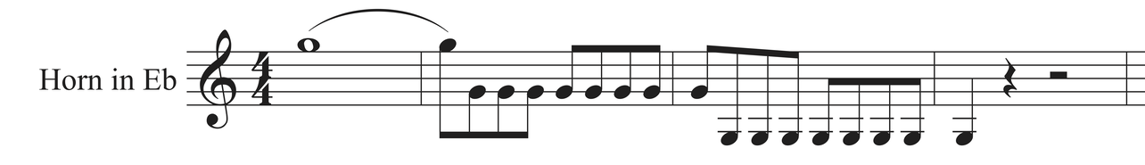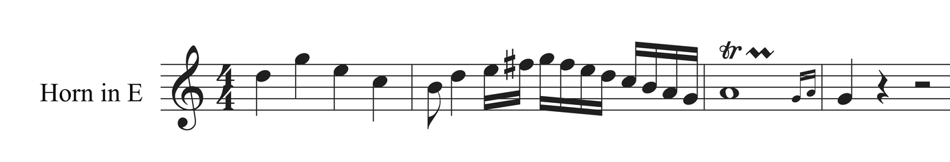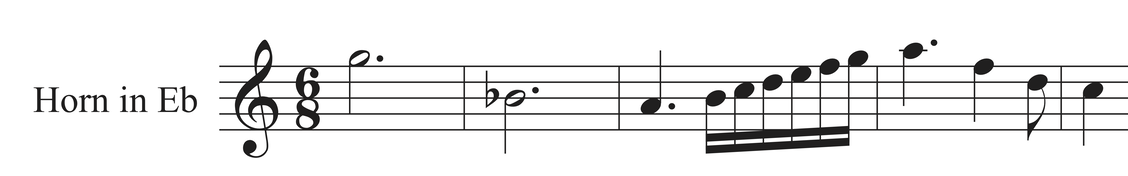Another consequence is that the naturally flat harmonics for which we usually need to open the bell completely (B flat, F sharp, A…) suddenly required less movement from the hand, because it is already so out of the bell. Their use was then not such a big deal at the time because they required less work on this horn ; I even suspect they would barely correct those notes by moving the hand at all. It now makes the opening of the fragment in E flat below (which I considered tricky) very easy.