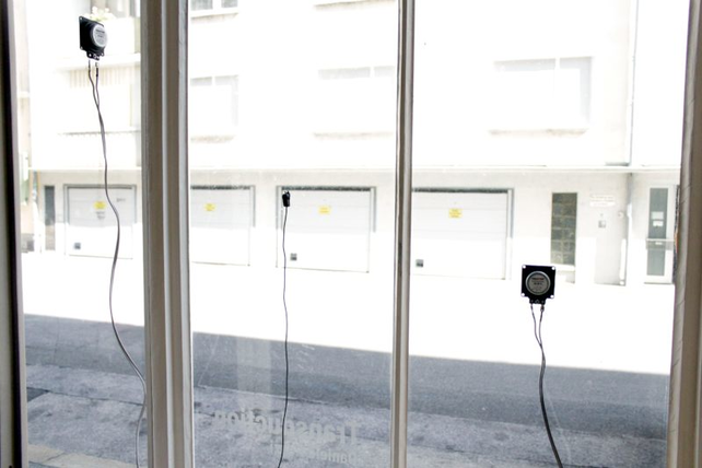 A generative, site specific sound installation conceived by Daniele Pozzi for the facade of the atelier and exhibition space Reagenz. The work is installed in a small window niche next to the entrance door and connects a physical setup—consisting of three thin glass surfaces, one pick-up microphone and two transducers—with a digital feedback delay network. The transducers excite the glass, creating two oscillating membranes that project sound outside, and simultaneously the microphone feeds these vibrations back into the software for further sound processing.