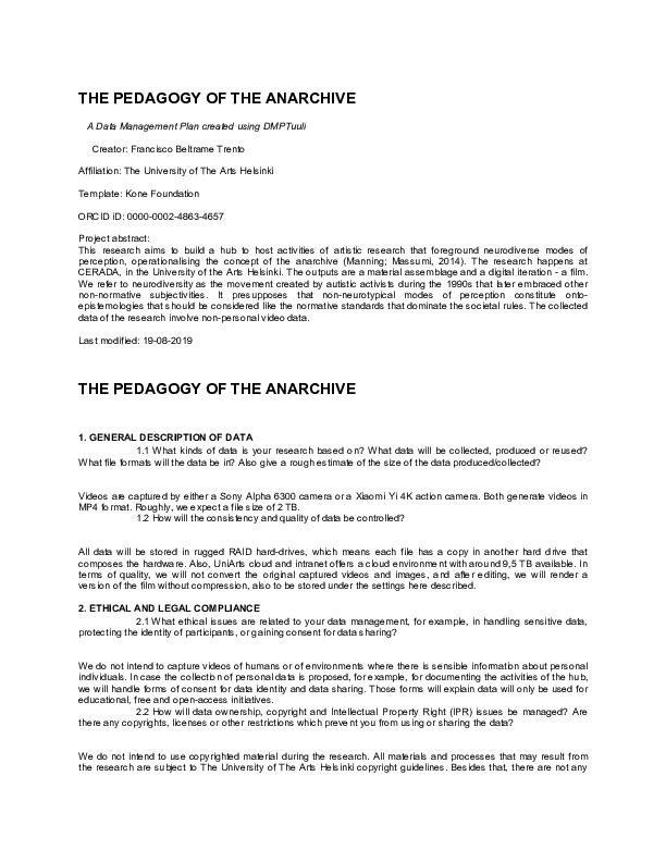 The Pedagogy of the Anarchive is a research proposal that aims to collectively build a hub for neurodiverse/crip/queer art and arts education practices. It is an in-disciplinary three-year project that will deliver multimodal outcomes, like an ever-mutating assemblage/installation, a film and publications. The boldness of the proposal relies on making visible underrecognized modes of perception and relationalities in arts education and artistic research, critically approaching them with pedagogies that deconstruct the archival neurotypical tendencies. To prototype the iterations of the material assemblage, we will use diverse materials and textures, like textiles, pieces of furniture and art supplies. Ideally, the space will be co-composed as we host activities. We will employ the anarchive as our conceptual and operational apparatuses. The anarchive emerged from the necessity to overcome the idea of archiving a past event or proposition. It understands the register or the objects not as representations or essences but through their traces that potentially can activate new propositions. Materials, like furniture, textiles, tape measures, acrylic tools, raw treated bamboo, paints and cardboard, are understood relationally. We ask: how can we assemble them to privilege underrecognized modalities of perception? It is “not documentation of past activity. It is a feed-forward mechanism for lines of creative process, under continuing variation (…) a cross-platform phenomenon (…) between media, between verbal and material expressions, between digital and off-line archiving, and most of all between all of the various archival forms it may take and the live, collaborative interactions that reactivate the anarchival traces, and in turn create new ones.” (Massumi, 2016). The theoretical framework we use is transdisciplinary, in the intersection of process philosophy (Erin Manning, Brian Massumi, Alfred North Whitehead, Gilles Deleuze and Félix Guattari), Queer Theory ( Lee Edelman, Paul Preciado, José Esteban Muñoz, Jack Halberstam), Critical Disability Studies, Neurodiversity and Neuroqueerness (Melanie Yergeau, Mel Baggs, Dan Goodley, Justine Egner) and the New Materialisms (Karen Barad, Stacy Alaimo, Jane Bennett). What the scholars from this extensive bibliography share, besides different their theoretical affiliations, is the appreciation of the concepts of relation and relationality beyond the human scope, recognising the agency of non-human bodies. For us, it is urgent to foreground that to begin undoing the neurotypical ableist and functionalist dominion of arts and arts education. It is also critical to bring awareness to the complex relations of causality that entangle the anthropotechnical construction of the man at the cost of the consequences of the Anthropocene. At the same time, the concerns and concepts shared by these scholars must be "bent" and re-thought by the lenses that detour the dominance of the Global North onto-epistemologies. Pereira (2019, p. 64), while talking about Decolonial Queer Theory, affirms that bending implies "a rereading of the Global North’s theories in order to revise them, bend them, scrutinise their silences and obliterations, and to make them speak differently".