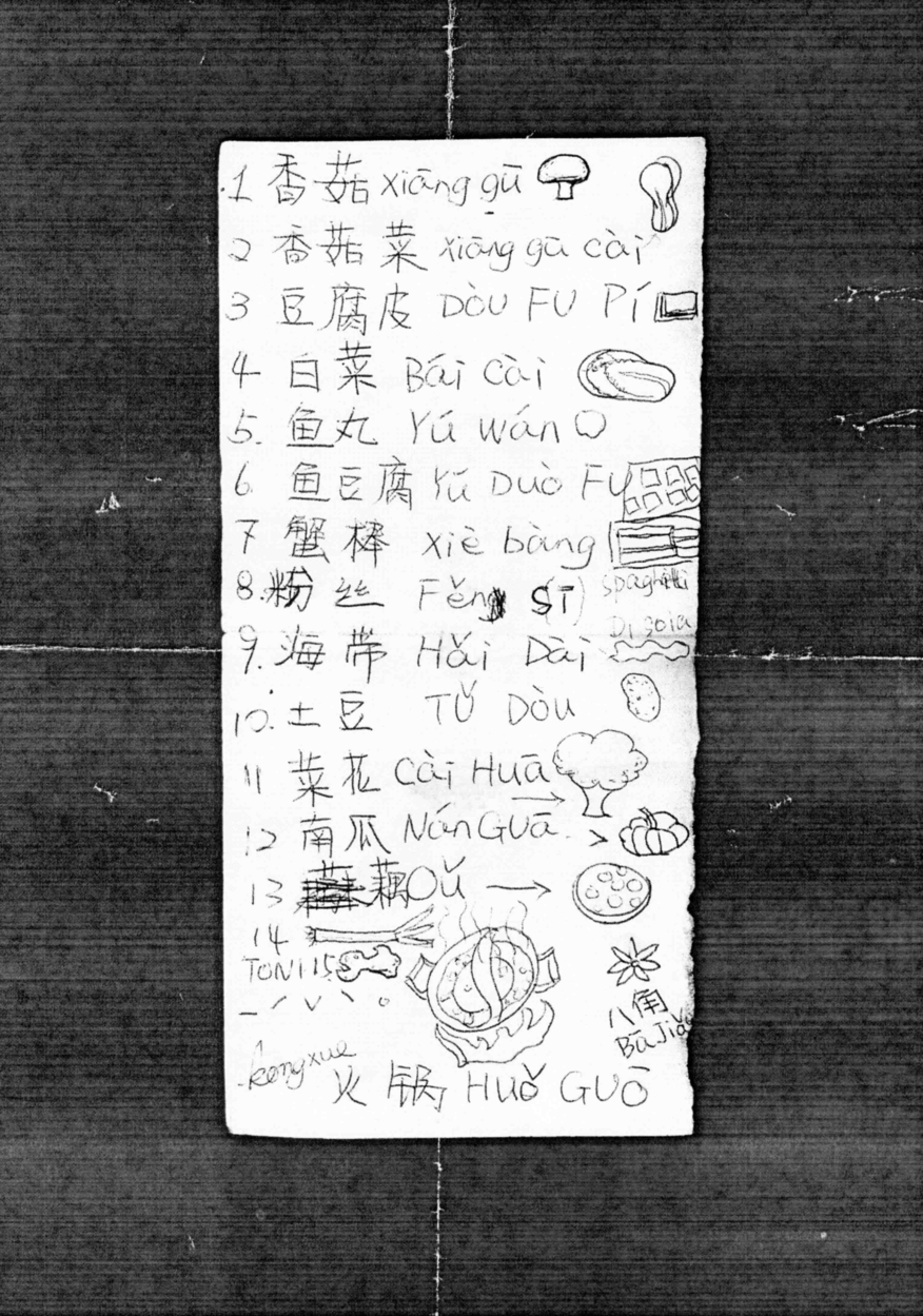 "Ideogram, phonetic transcription and stylised drawing: Xue Kong’s list of the ingredients needed to make Huo guo is, to me, a rudimentary illustrated dictionary, essential to link signifiers and meanings, and to make sense of the mishmash of Mandarin Chinese, Wenzhounese dialect and biodiversity.