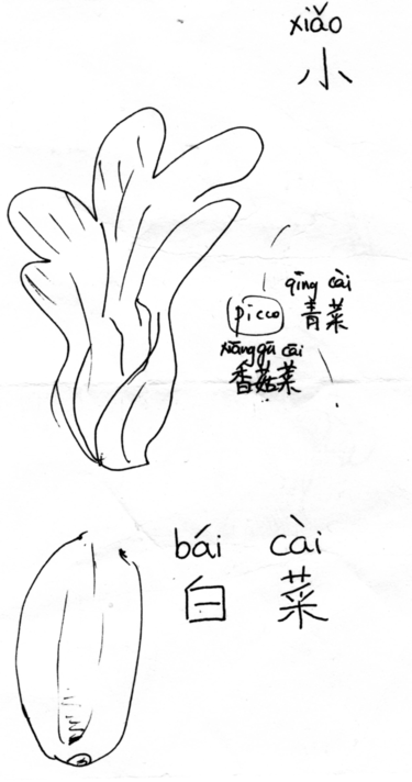 “Xiao bai cài, bok choy or qing cài?[...] I interview a Chinese farmer; he shows me his vegetable garden. I notice a vegetable, which doesn’t have a name in Italian (he tells me that it doesn’t exist in Italy). I insist on knowing its Chinese name. Back home I listen to the audio-recording, and on the Internet I look up the transcription of that fleeting sound - something like shao bai tzai. The search engine suggests xiao bai cai - Google seems to have corrected my mistake in transcribing phonetically - I eventually end up in a discussion forum: “What is xiao bai cai? bai cai is the Mandarin spelling/pronunciation of bok choi, which is Cantonese. Xiao means little. Thus it can be translated as “little bok choi”, which could mean the smaller version of bok choi, a leafy vegetable with bright white stalks and dark spinach-green leaves [...] Another farmer call it qing cài”.