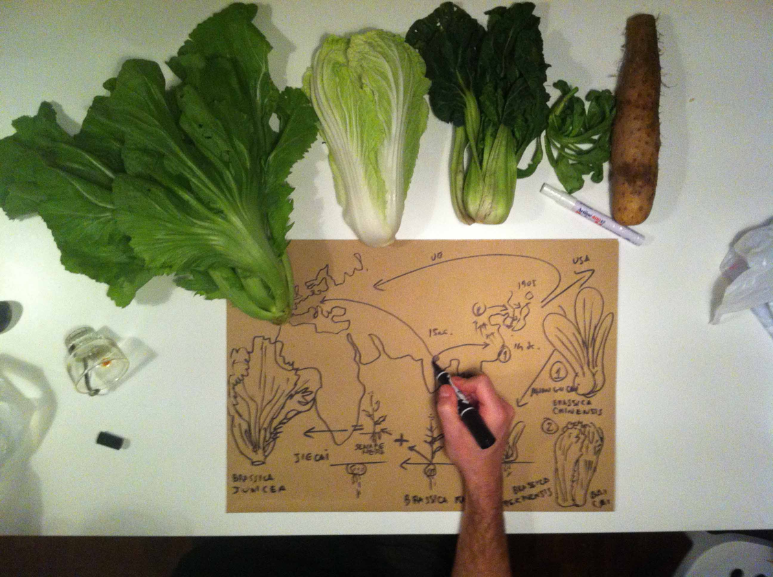 the vegetable named by Linnaeus Brassica Rapa, domesticated in India in XV Century BC, that later spread in Europe in the form of a tuber (Turnip) and in China in the form of edible-leaves vegetables, named Barassica Rapa Chinensis (Bak Choy in Cantonese), which is now cultivated by Chinese farmers in Tuscany. A crucial element is the “colonisation” of the “real” by the procedure of mapping and naming. Still now, to designate these ancient vegetables, we universally use the Latin terms imposed in XVIII Century by the Sweedish scientist Linnaeus. In my research I’m questioning the neutrality and legitimacy of this unilateral universalism.