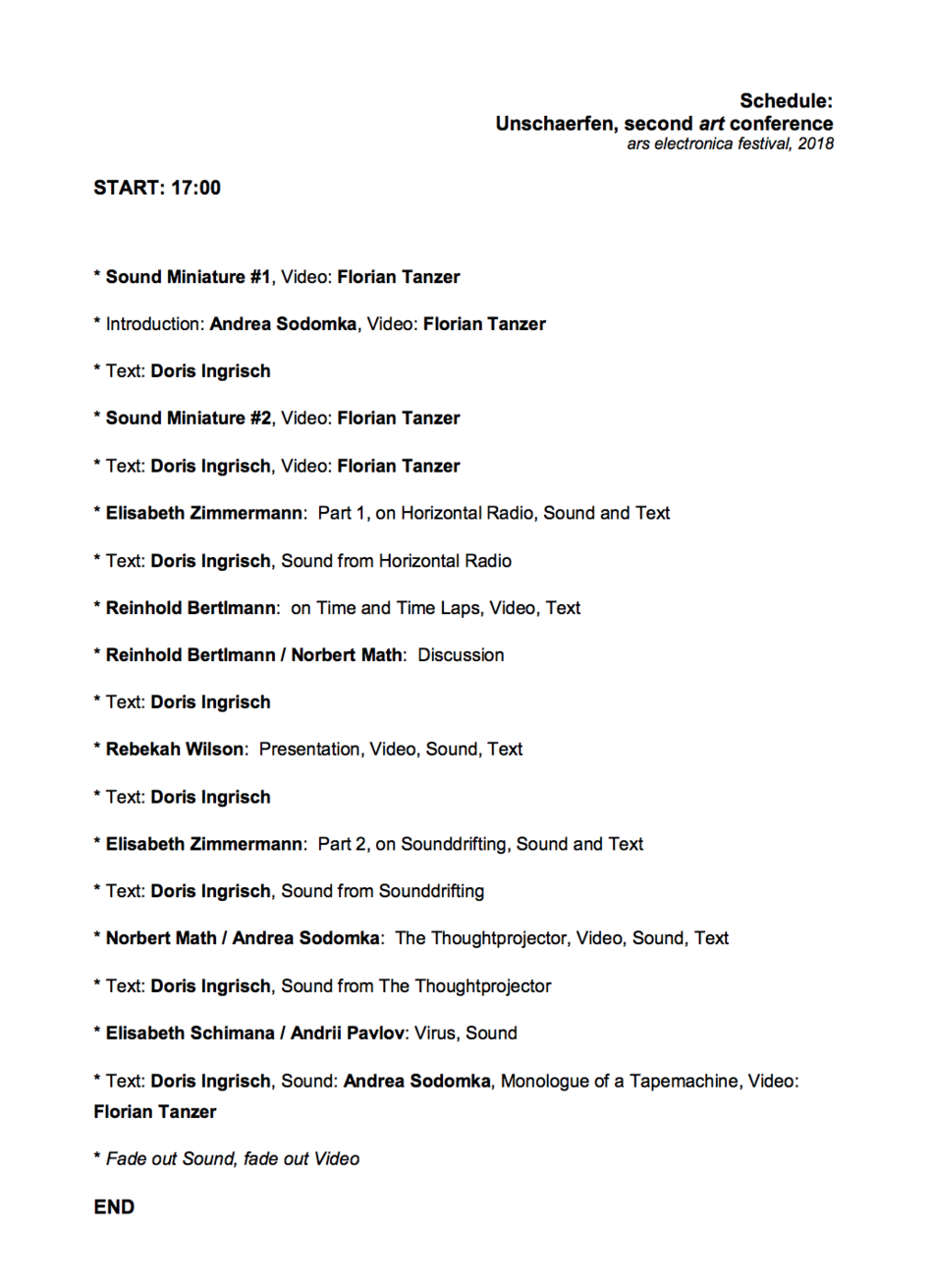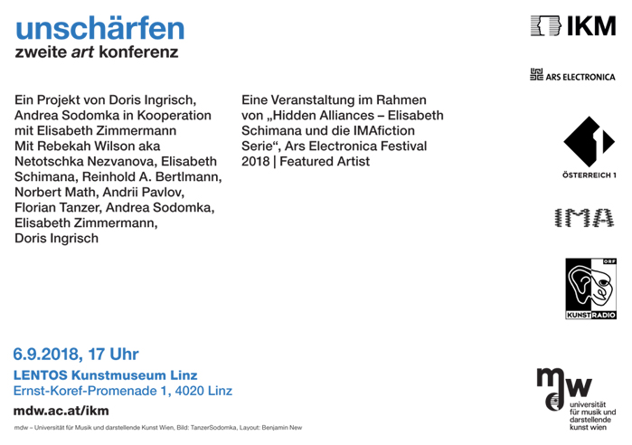 Several events took place as part of the exhibition "Hidden Alliances - Elisabeth Schimana and the IMAfiction Series". Among them on September 6th in the Lentos linz art museum at 5:00 pm "UNSCHÄRFEN - second art conference" that approached the issues of simultaneity, networking and time.