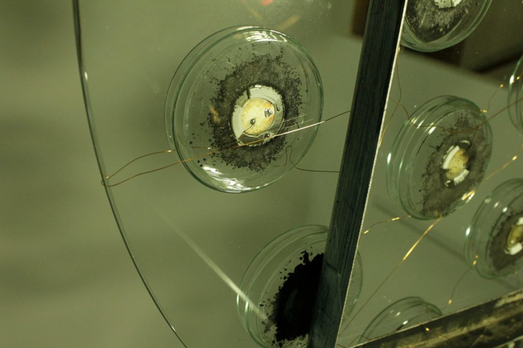 The display of the installation is through a circular field of petri-dishes which contain piezo speakers, arranged in a certain number of channels, and thus the sound gesture may move around the circle as it evolves.