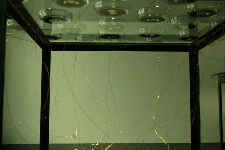 The physical arrangement of the third instance is still not decided (as of this writing), although I think I want to replace the “disc” like shape of the petri-dish placement with a form that places them along the walls of the exhibition site, e.g. on side boards.