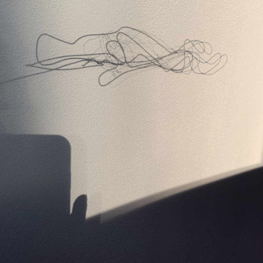 As a sculptor it was natural to move from drawing to 3-Dimensional planes. Wire was utilised to make small prototypes of these ‘drawings in space’ as the expression of distance, through intention could and did take a multitude of forms through changes in direction. The basis of the instrument therefore was taking shape. The focus then turns to how does one engage with the instrument and what is the engagement with the instrument creating. As Otso was not particularly interested in pitch, I took the liberty to play around with what the instrument was expressing and articulated. As established previously, each object contains sound, or the potential for there to be sound, likewise every motion contains some form of sonic energy. Therefore engaging with the instrument would inevitably result in some sonic output. That was however not the focus of this instrument. The distance instrument articulates light, creating the image, a moving image. The distance instrument is therefore an implement for composing acousto-cinematic sculpture. Is that a thing? The instrument is played rhythmically, to a certain extent even by ear. In this prototypal stage, the wire prototypes are attached to a cordless drill, and as the drill revolves, new images are formed, both in solid form as well as in shadow. It was the ear that determined the pattern with which the speed of the drill was controlled.