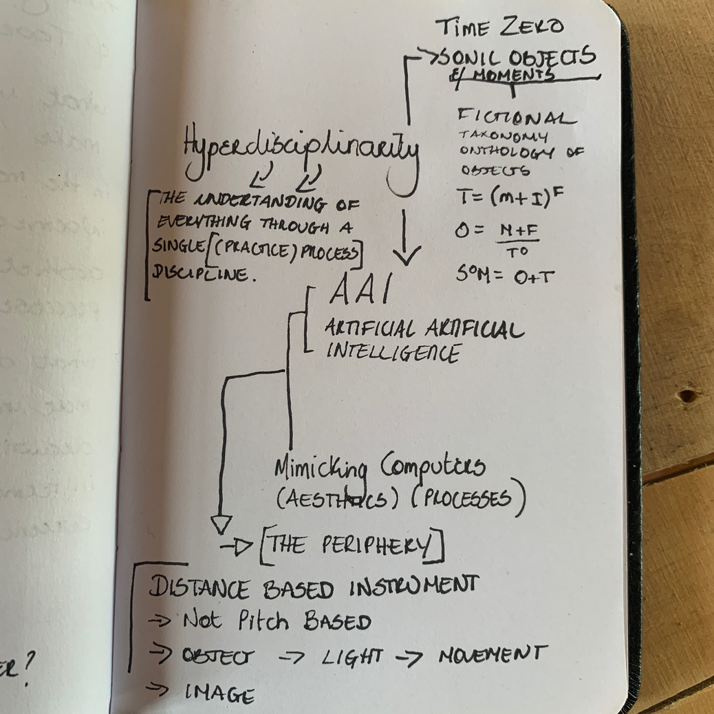 Time Zero departs from the notion that time, or at least humankind’s understanding of it is a fictional construct. Time Zero as a concept works on the idea that time is created by motion. Each event creates time and therefore time is the effect of motion, leading to the perception of time as a measure of distance, a distance between events. Actions need not be regular or patterned in a specific manner. Time is therefore understood as the distance between one event and another. Time Zero is also intrinsically tied with materiality, sonic materiality to be more precise.