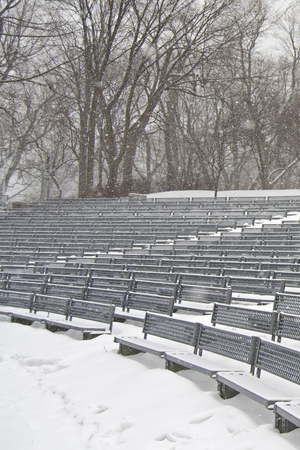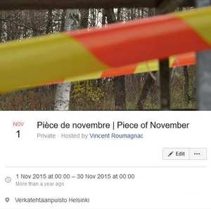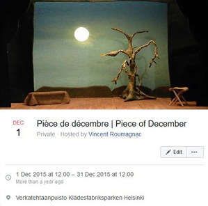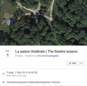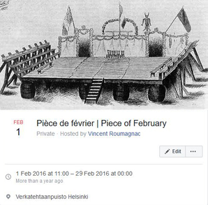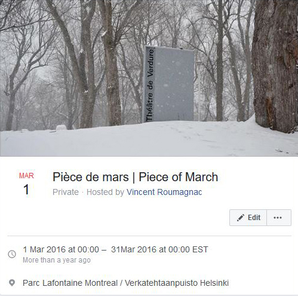 Piece of March: The project is relocated for the first fifteen days of March in an open-air theatre (théâtre de verdure) in Montreal, Québec, Canada. On the 1st of March, I fix promotional posters, showing the theatre in Helsinki under the snow, on the gates of the theatre. Back in Helsinki, on the 16th of January, I fix promotional posters, showing the theatre in Montreal under the snow, around the theatre.