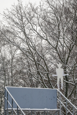 Piece of February: On the 1st of February, I erect an articulated jumping-jack, as found in the Basque pastoral setting, to the top of the left bleacher.