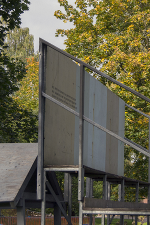 Piece of October: On the 1st of October, I write the verse nec gemino bellum Troianum orditur ab ovo; semper ad eventum festinat et in medias res (Ars Poetica, Horatius) with adhesive black letters on the top of the right bleacher.