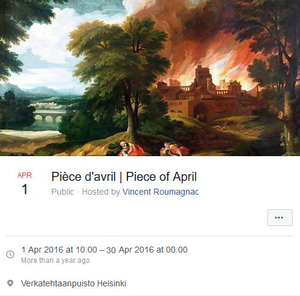 Piece of April: On the 1st of April, I ask my colleague-actor Outi Condit to go on-site anytime during the month, preferably several times, inviting them to improvise on spot on the motif of Cassandra. At the end of the month, I set the theatre on fire.