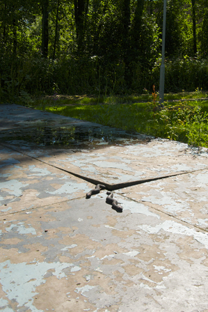 Piece of August: On the 1st of August, I place two plastic snakes on stage, as if coming out from below an eroded wooden plate.