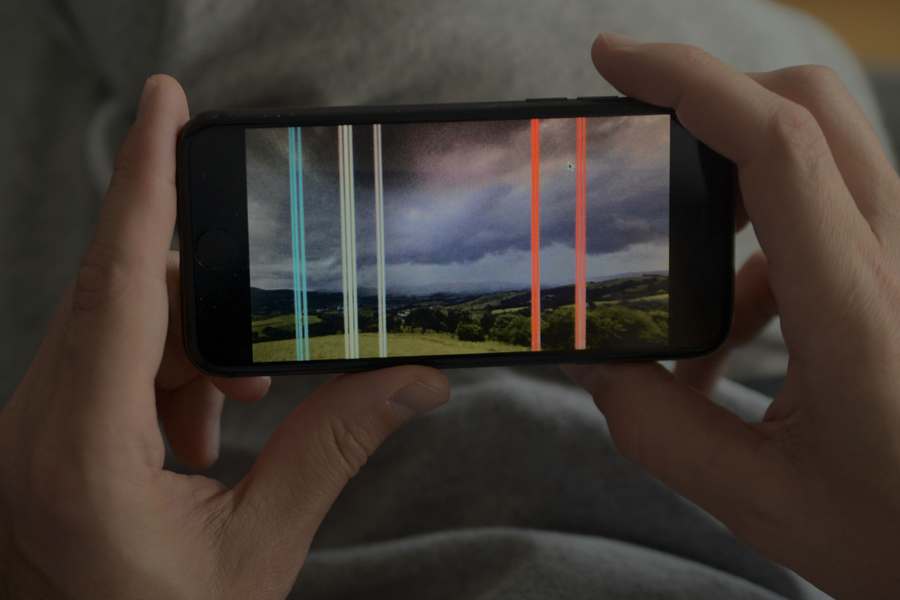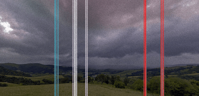 A screenshot of a landscape of Soule (Northern Basque Country) from Google ViewTM is darkened and barred vertically by three sets of stripes, blue, white and red. White noise is added to the composition, giving the landscape an artificial vibration. The image is transformed into a gif for mobile phone. Theatre events in the form of "landscape play" or pastorals from Soule (Northern Basque Country) are one of the oldest forms of culture in the Basque Country. They are speculated to have their origins in the miracle plays of the Middle Ages. Originally lasting two days, they were shortened to a single day, and then, at the beginning of the twentieth century, to six hours (an afternoon). Performed outdoors, the pastorals are dependent on sudden Atlantic changes of weather. The scenographic device is rather simple, consisting of a wooden stage built in a field, with as background a pictorial breakthrough on the surrounding pasture mountains. Three doors allow for movements between the stage and the backstage: a red door (hell) a blue door (heaven), and in the middle, a white door (for, according to different academic sources, light, snow, passage and/or purification). In the work, these doors have turned into a triple vertical stripe-like glitch.