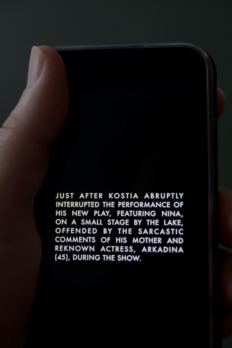 Lokki is ‘seagull’ in Finnish. Lokki is a literally postdramatic theatre piece. The twelve one-minute sequences correspond to the twelve scenes in Chekhov's play. They were shot with a smartphone during Midsummer in mid-Finland near Jyväskylä and posted on social media on registered spectators' Messenger (Facebook TM).