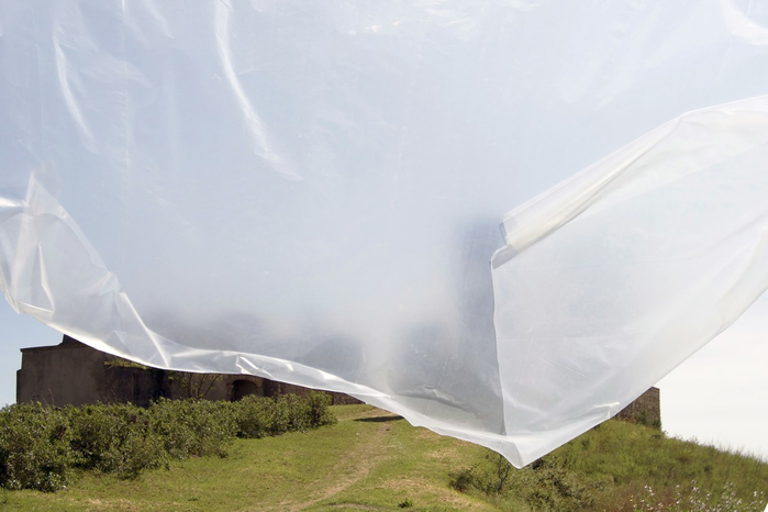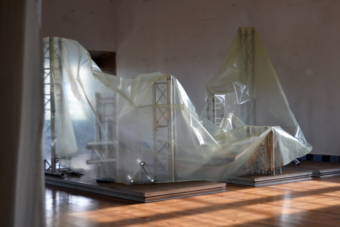 Backdrop (Experiment) is a series of tests carried out during a research residency in O Espaço do Tempo (Montemor-o-Novo, Alentejo, Portugal). It consists of a double outdoor test-installation and an indoor test-installation (including two video documentations from the outdoor installations). The project was eventually finalized and installed for the exhibition You Gotta Say Yes To Another Access in the Research Pavilion in the context of the 57th Venice Biennale. The installation is made of PVC film, steel elements for the construction of a temporary outdoor stage.