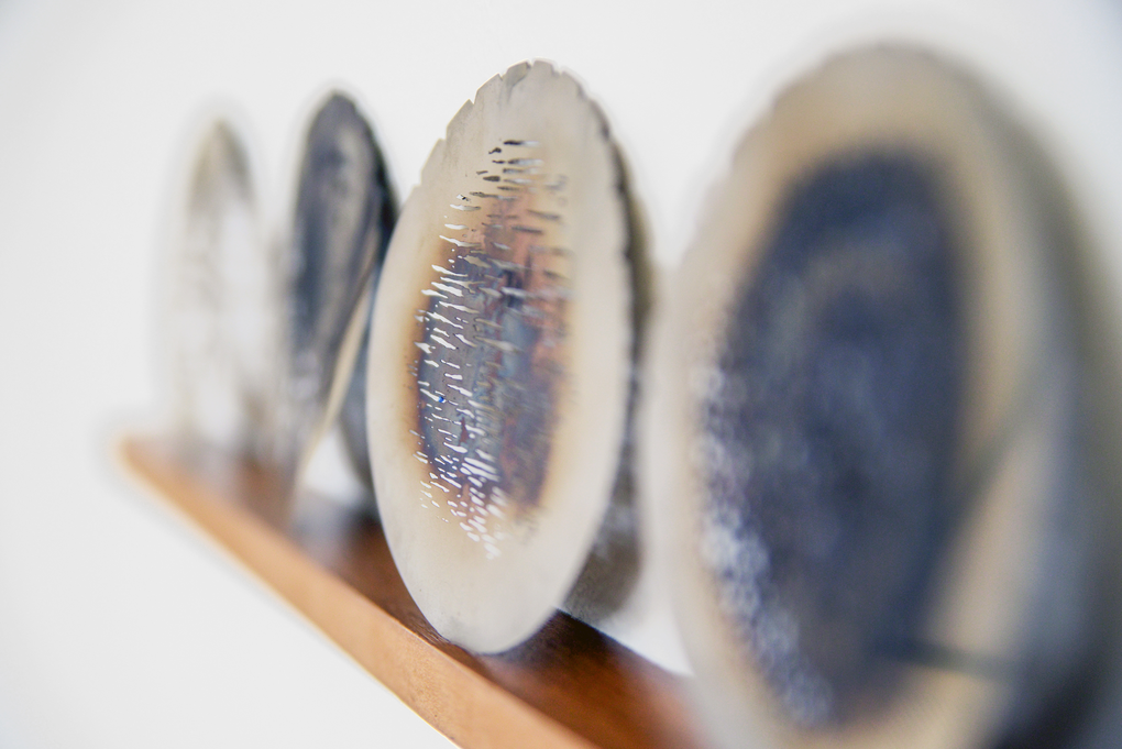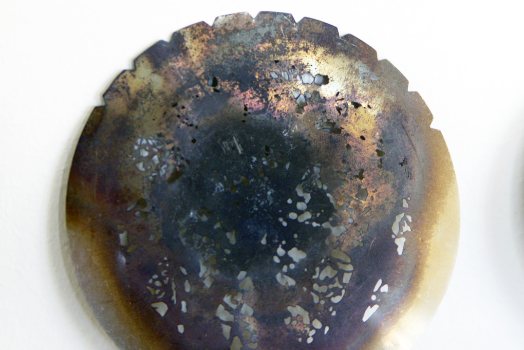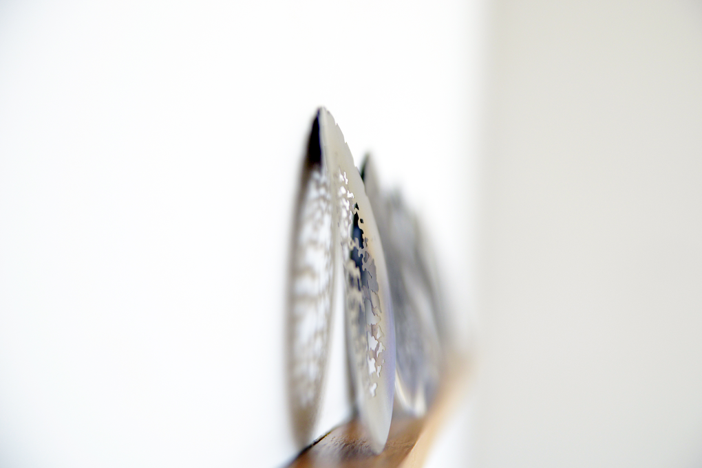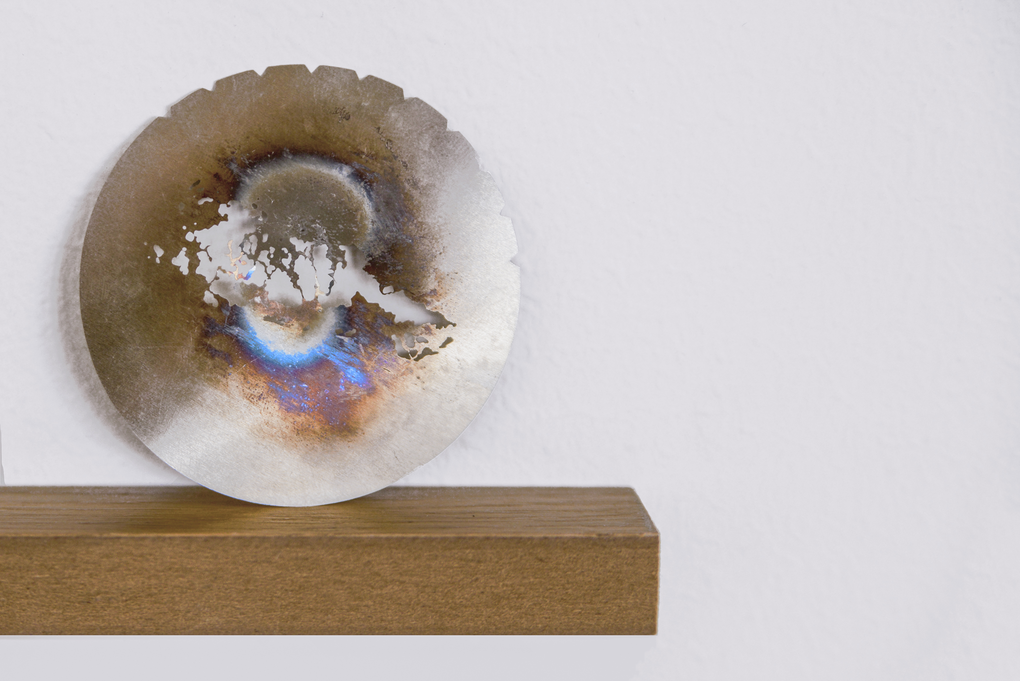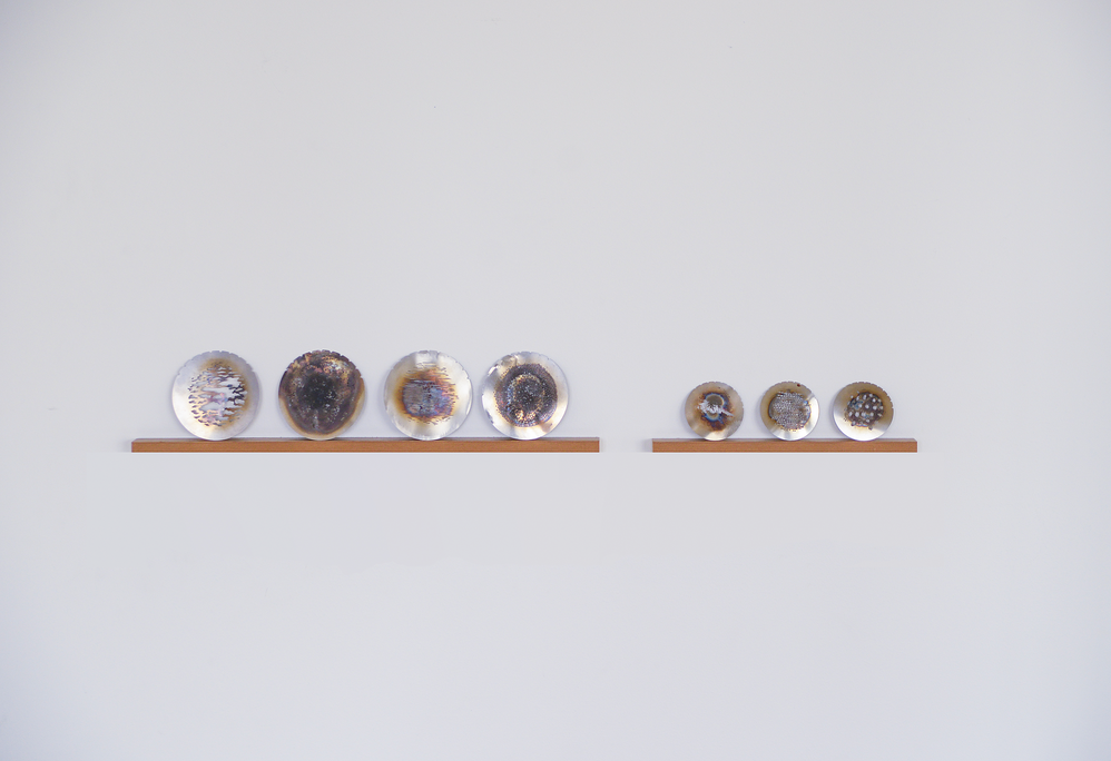 Seven used gobos, of two different sizes, and found in the light department of the Theatre Academy of Helsinki where the research takes place, are exhibited as such, as readymades. Their patterns correspond to clouds, leaves, grass and sea waters. The discolored oxidation of the stainless steel and the slight distortion of the metal are caused by the high temperature of the lamp of the stage projector.